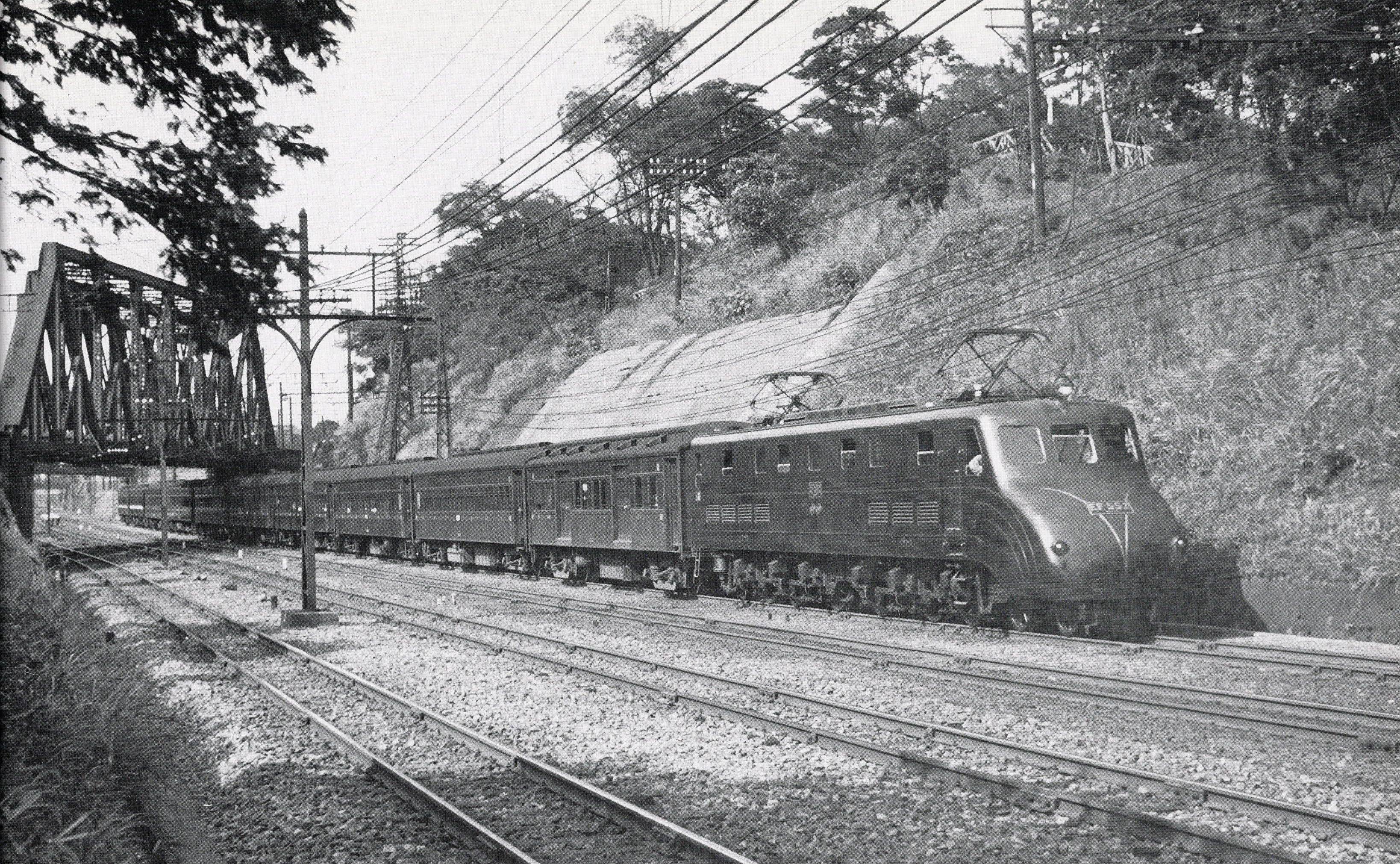 국철 EF55형 전기기관차가 1936년 8월 4일 시나가와 부근에서 ''후지''(도쿄–시모노세키 특급열차)를 견인하는 모습
