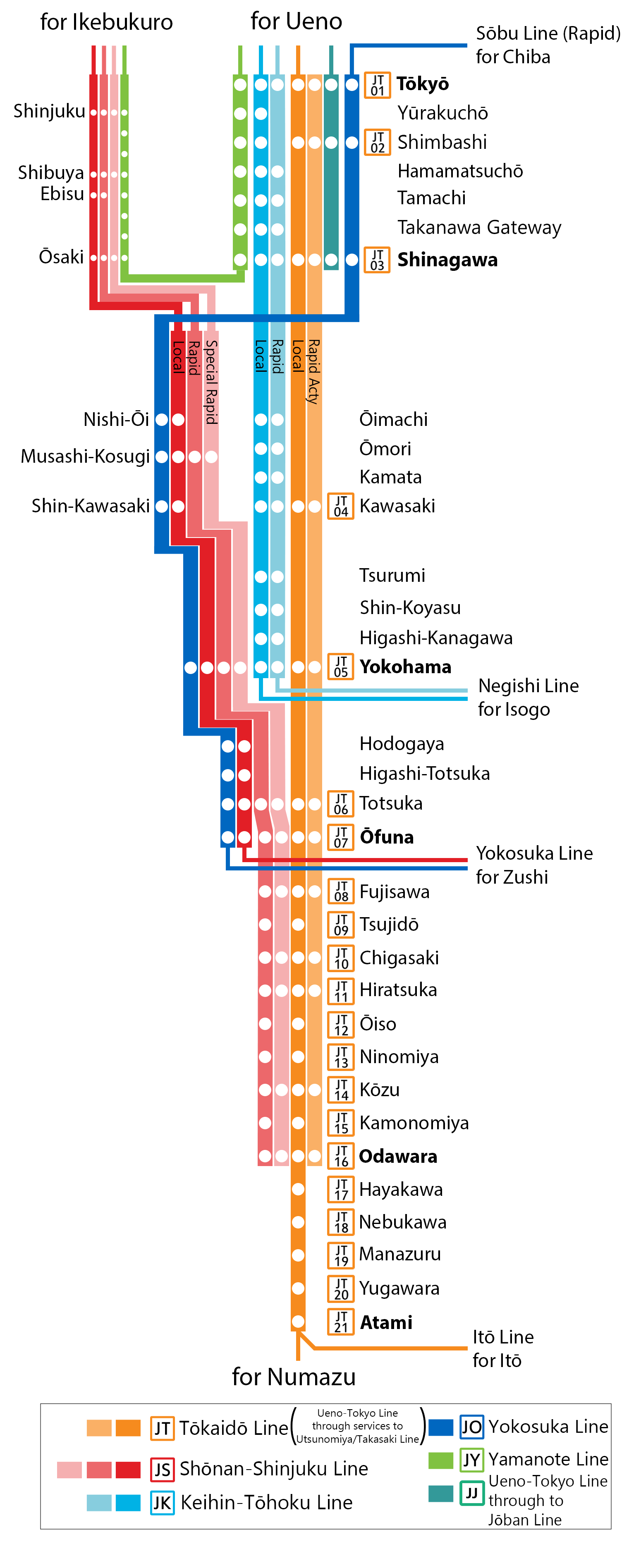 [[파일:JR JT line symbol.svg|20px|JT]] : 도쿄역 - 아타미역 간 열차선 [[파일:JR JK line symbol.svg|20px|JK]] : 도쿄역 - 요코하마역 간 전차선 [[파일:JR JS line symbol.svg|20px|JS]] : 오사키역 - 오후나역 간 [[파일:JR_Central_Tokaido_Line.svg|20px|CA]] : 아타미역 - 마이바라역 간 [[파일:JRW kinki-A.svg|20px|A]] : 마이바라역 - 고베역 간