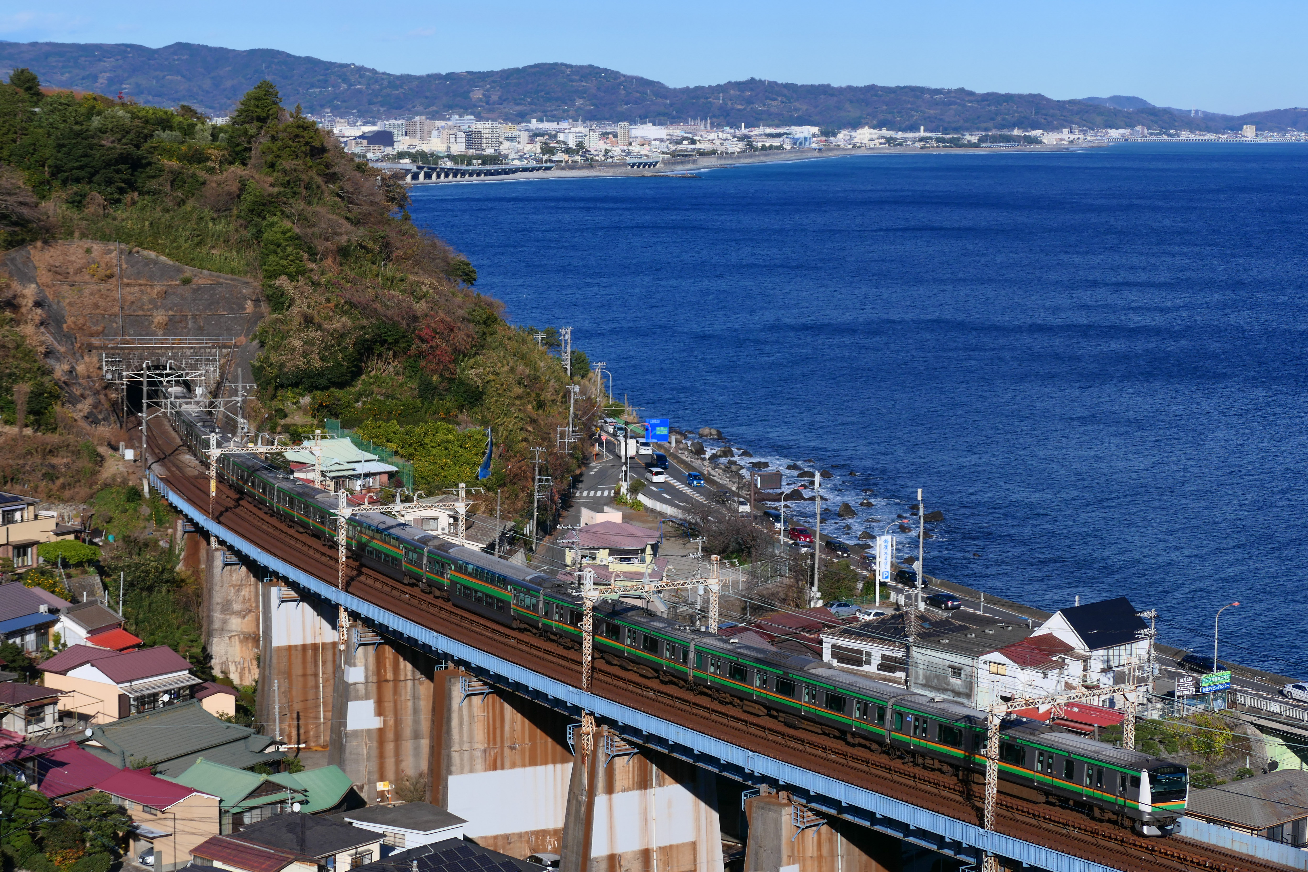 해안선을 따라 지나는 구간은 적고, 하야카와역 - 아타미역 간과 가마하라역 - 오키쓰역 간이 해안선에 부설되어 있으며, 고후쓰역, 요시와라역, 요손역, 벤텐지마역 부근에서 약간 해안선을 따라 지난다. 당시 군부는 다른 나라 함대에 의한 철도 함포 사격을 우려하여 산간 지대에 부설할 것을 요청했기 때문이라는 설이 있다.
