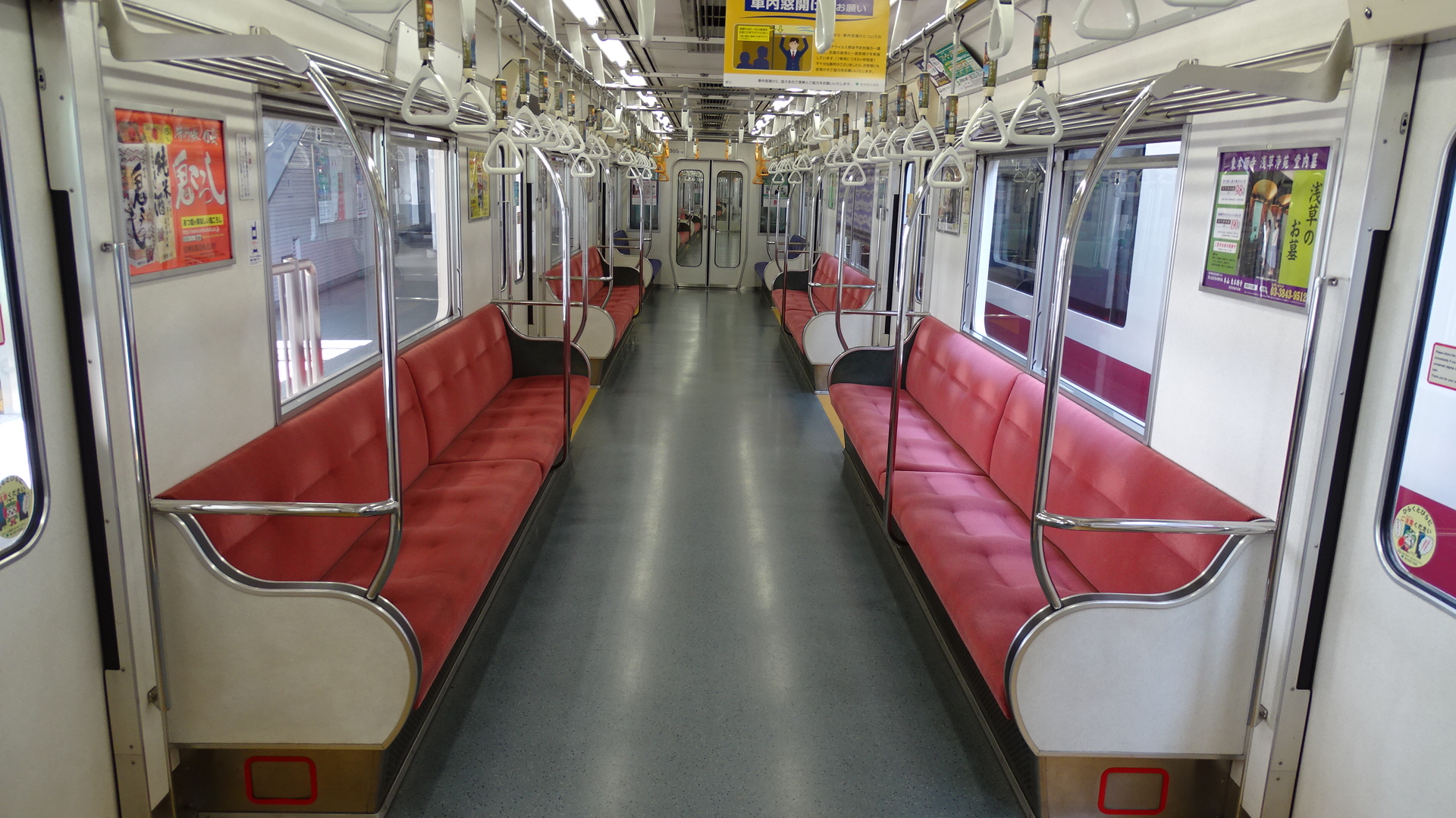 좌석은 버킷형 롱 시트이며, 겉감 색상은 등받이는 "벚꽃"을 표현하는 코랄 핑크색, 좌면은 "흙의 향기"를 이미지하는 다크 그레이색으로 했다.[12] 롱 시트 끝에는 팔걸이가 있지만, 1, 2차 차량은 팔걸이 안쪽이 짙은 녹색 천으로 덮여 있고, 팔걸이 주변 곡선부에 검은색 라인이 들어가 있다. 3차 차량 이후는 안쪽은 흰색 플라스틱(차내 화장판과 동일)으로, 주변은 스테인리스강으로 되어 있다.