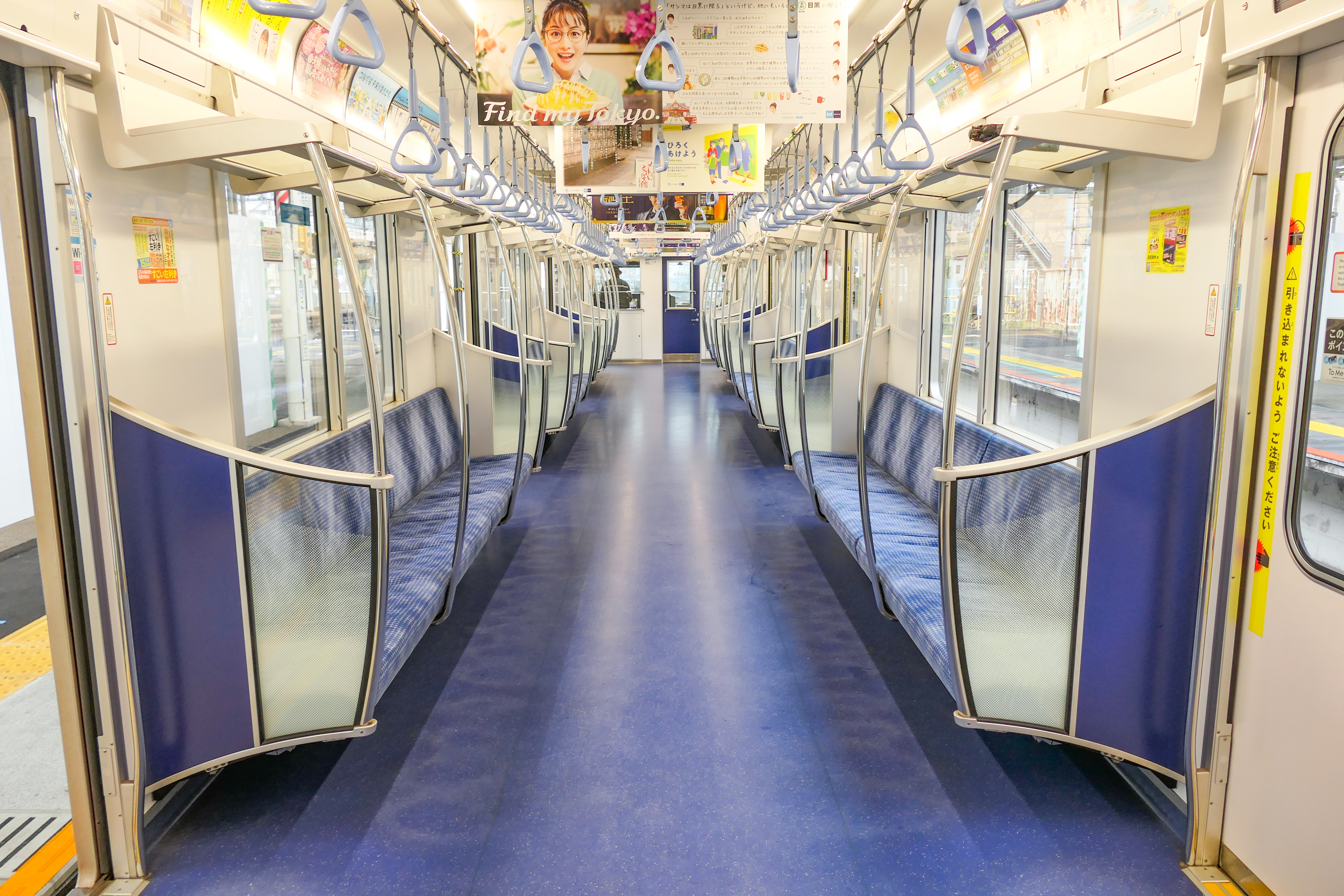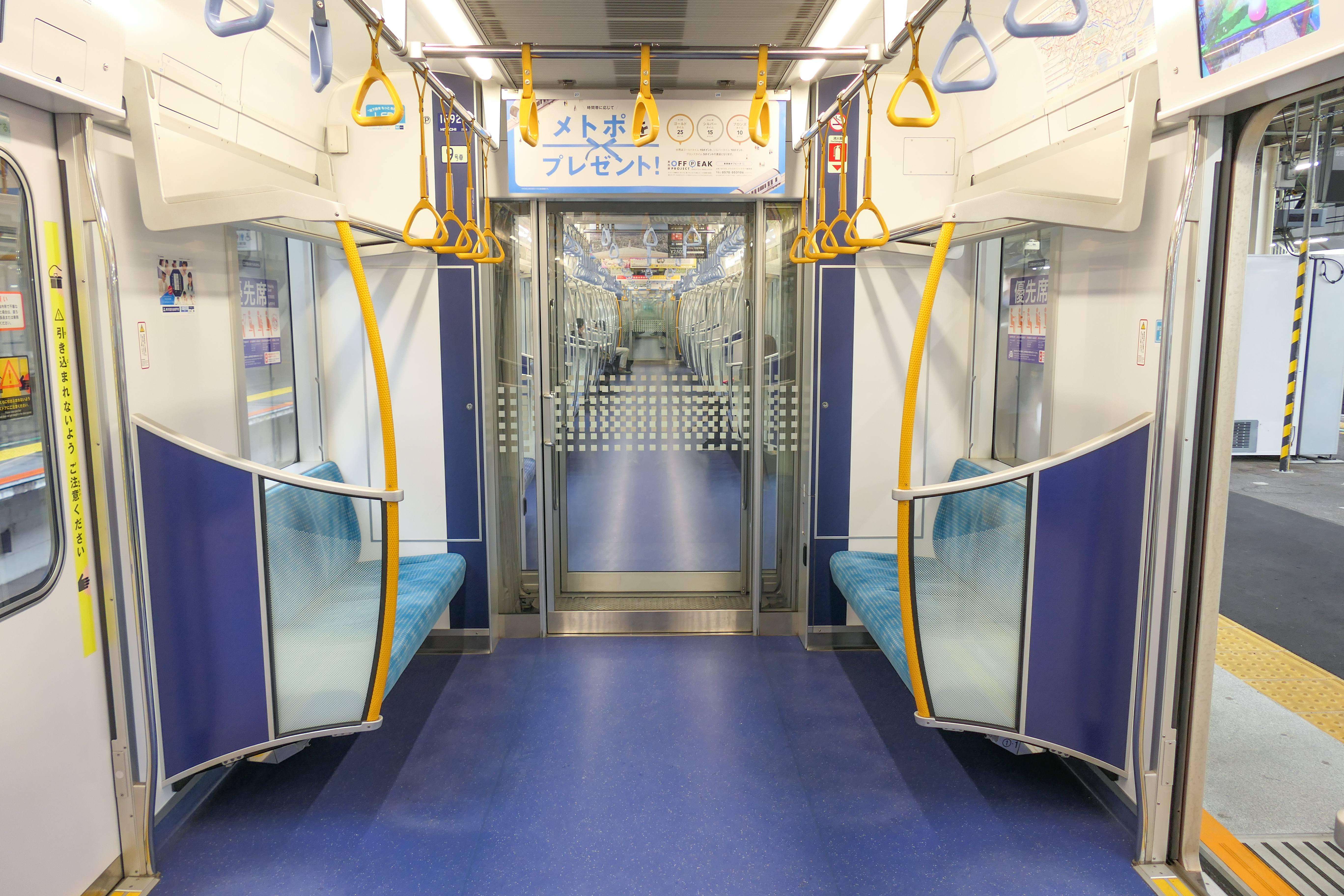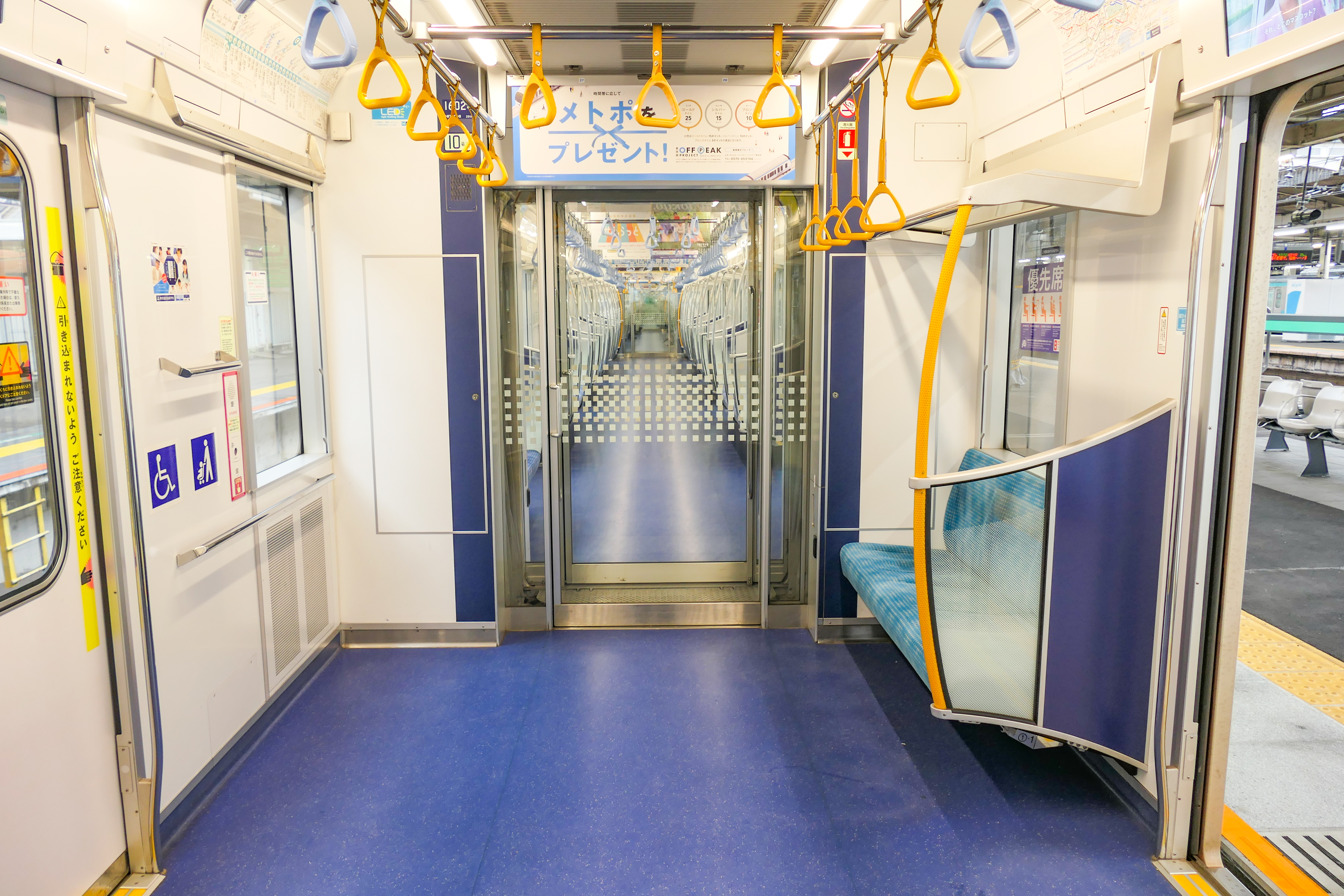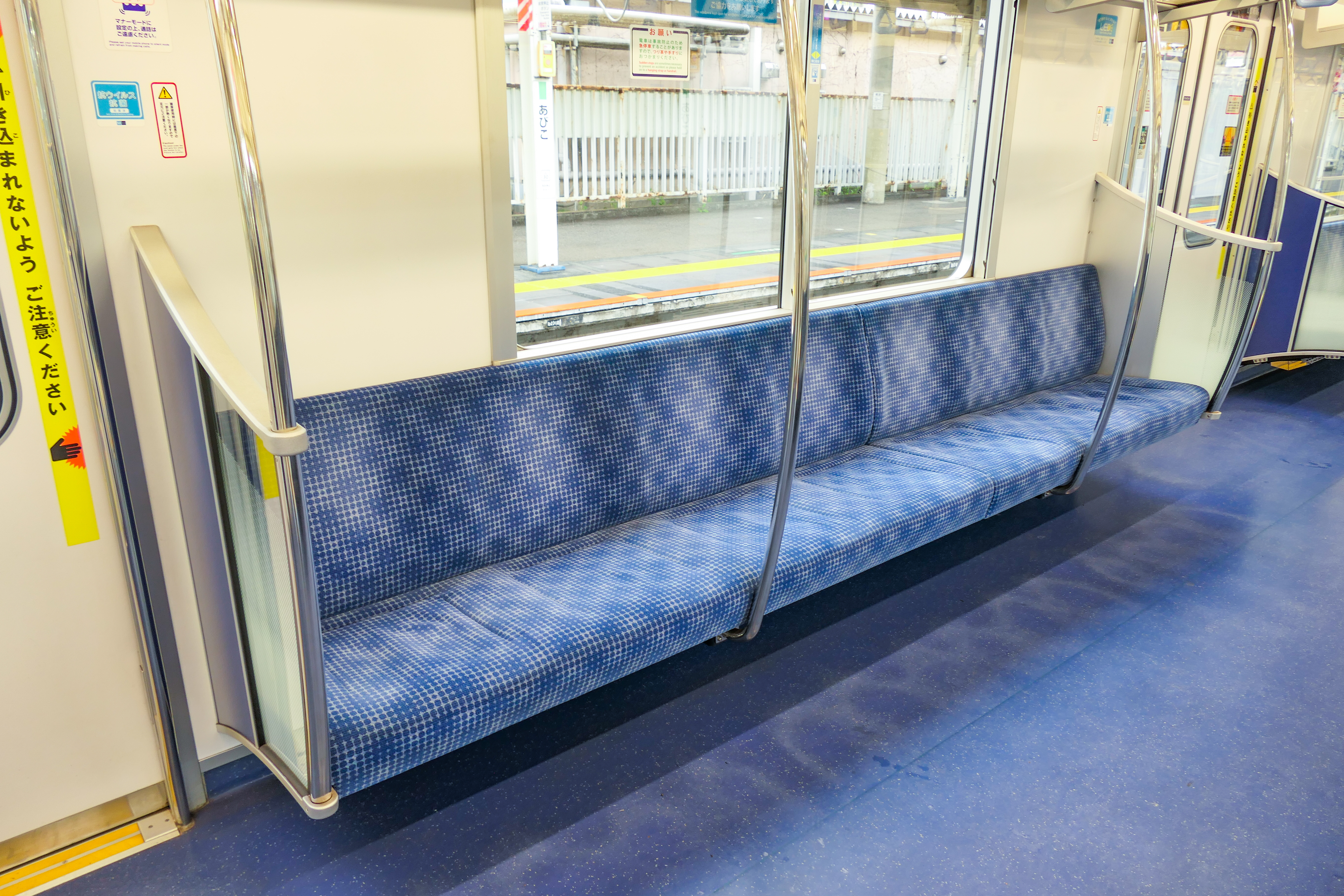 객실 내부는 흰색을 기본으로 남색을 포인트 색상으로 사용하여 차분하고 쾌적한 분위기를 조성하였다. 측면 천장부는 곡면 형태로 만들어 넓은 공간감을 제공하며, 중앙 천장부는 보조 송풍기(라인델리아)와 냉방 배출구가 일체화된 패널 구조를 채용했다.좌석은 출입문 사이에 7인용, 차량 끝부분에 3인용 롱시트를 배치하였다. 좌석 폭은 460mm로 버킷 시트를 채용하고, 좌석 표면은 타츠무라 미술 직물제의 것을 사용했다.[25] 남색 모켓을 사용했다. 좌석 위쪽 짐 선반에서 완만한 곡선을 그리며 내려오는 스탠션 폴(손잡이 봉)을 설치하여 유니버설 디자인을 고려했다. 7인용 좌석의 스탠션 폴 중 안쪽 2개는 2명, 3명, 2명으로 앉을 수 있도록 구분하는 역할을 한다. 측면 창문은 출입문 사이에는 2칸짜리 개폐 가능한 하강 창문을, 차량 끝부분에는 고정 창문을 배치하고, 햇빛 가리개로는 롤업 커튼을 설치했다.