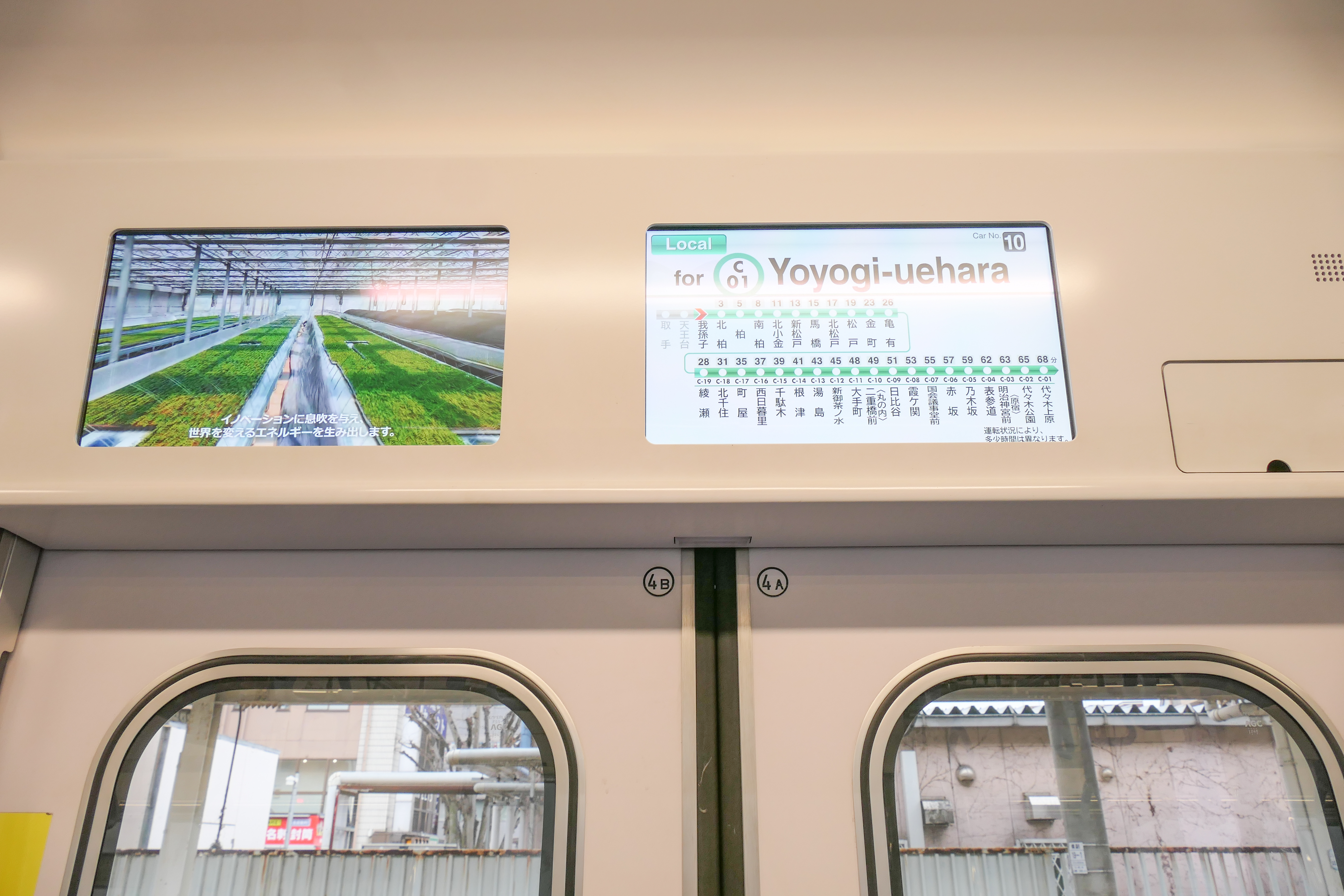 각 출입문 위에는 17인치 액정 디스플레이(TVIS)를 사용한 차내 안내 표시기 2대를 설치했다. 왼쪽 화면은 도쿄 메트로 비전의 광고동영상용, 오른쪽 화면은 행선 안내, 환승 안내 등 승객 안내용으로 사용한다. 출입문 점검 덮개는 알루미늄 압출재이지만, 주변 내장재와 맞춰 흰색으로 도색하여 차가운 느낌을 줄였다. 2020년경부터는 원맨 운전 대응 공사와 함께 LCD 옆에 방범 카메라가 설치되었다.