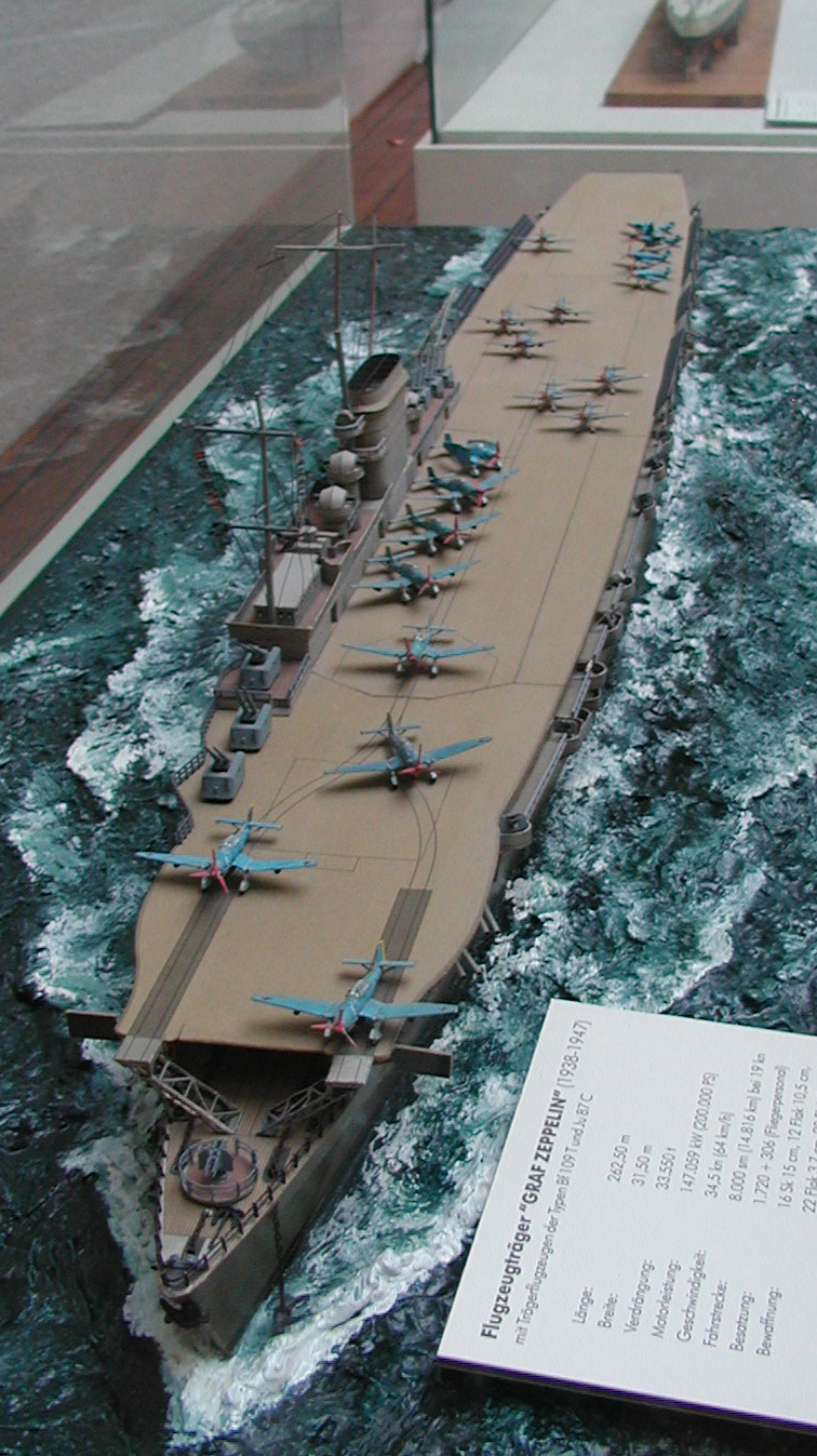 - '''그라프 체펠린''': 처음에는 '항공모함 A'(Flugzeugträger A|플루크초이크트레거 아de)라는 이름으로 건조가 시작되었으며, 1938년 진수식 때 그라프 체펠린으로 명명되었다. 제2차 세계 대전 중 건조가 중단되었고, 종전 직전인 1945년 4월 25일, 슈체친(당시 슈테틴)의 얕은 물에 침몰되었다.