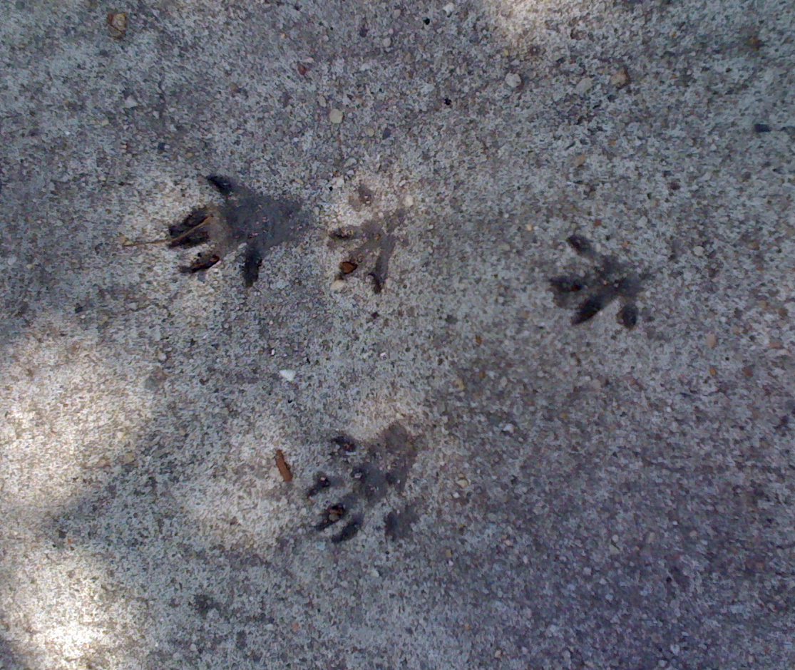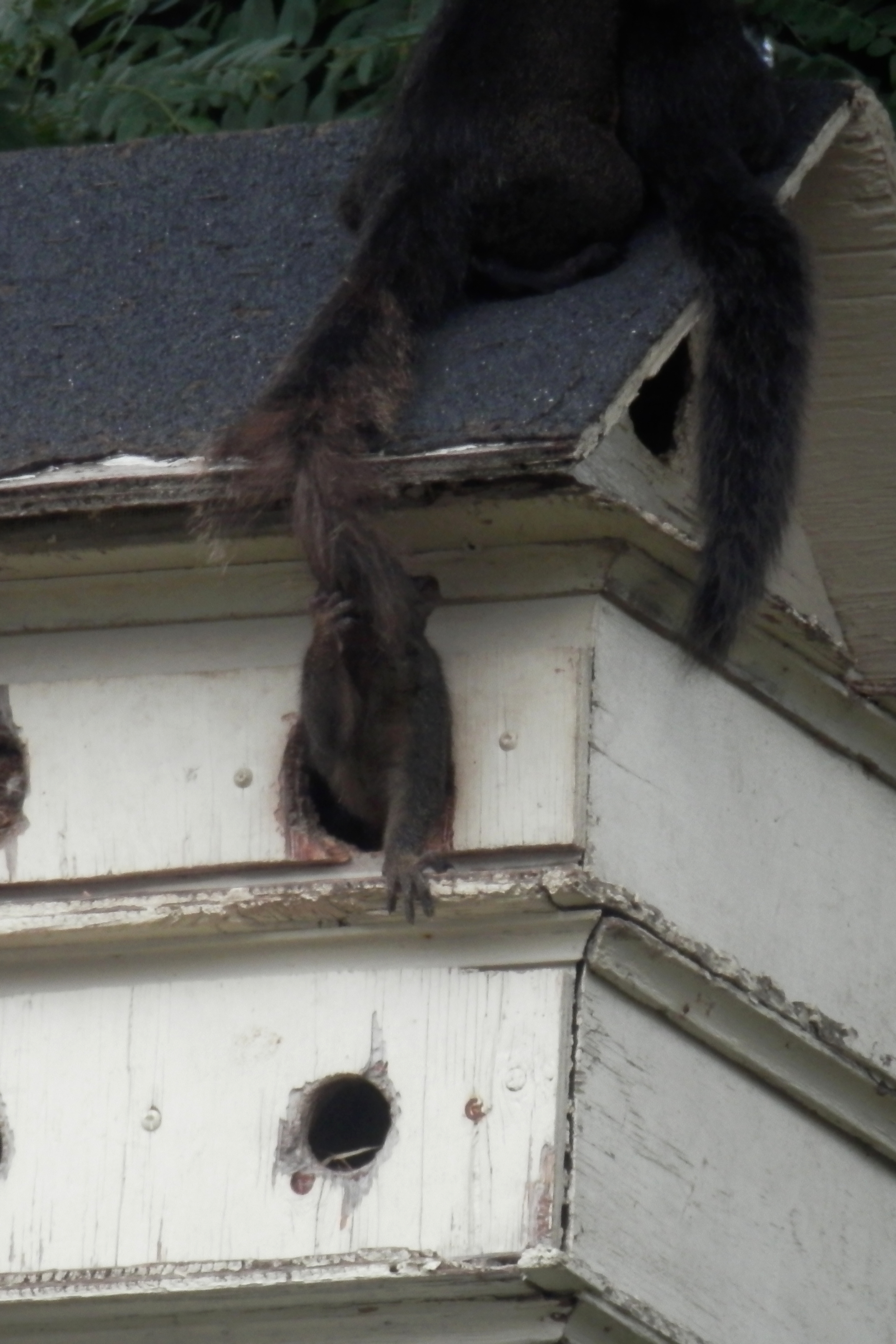 정원의 새 먹이통에 손을 뻗는 모습. 뒷다리의 각도로 인해 머리부터 나무를 내려올 수 있다.
