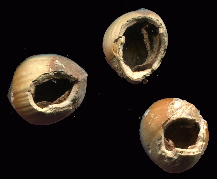 동부회색청서가 갉아먹은 개암. 앞니로 갉아먹은 흔적이 보인다