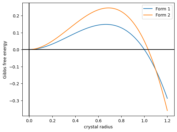 다형성의 간단한 모델은 구형 결정의 깁스 자유 에너지를 으로 모델링하는 것이다. 여기서 첫 번째 항 는 표면 에너지이고, 두 번째 항 는 부피 에너지이다. 두 매개변수 이다. 함수 는 하락하기 전에 최댓값까지 상승하여 에서 0을 교차한다. 결정화하기 위해서는 결정의 공이 에너지 풍경의 부분을 극복해야 한다.[59]