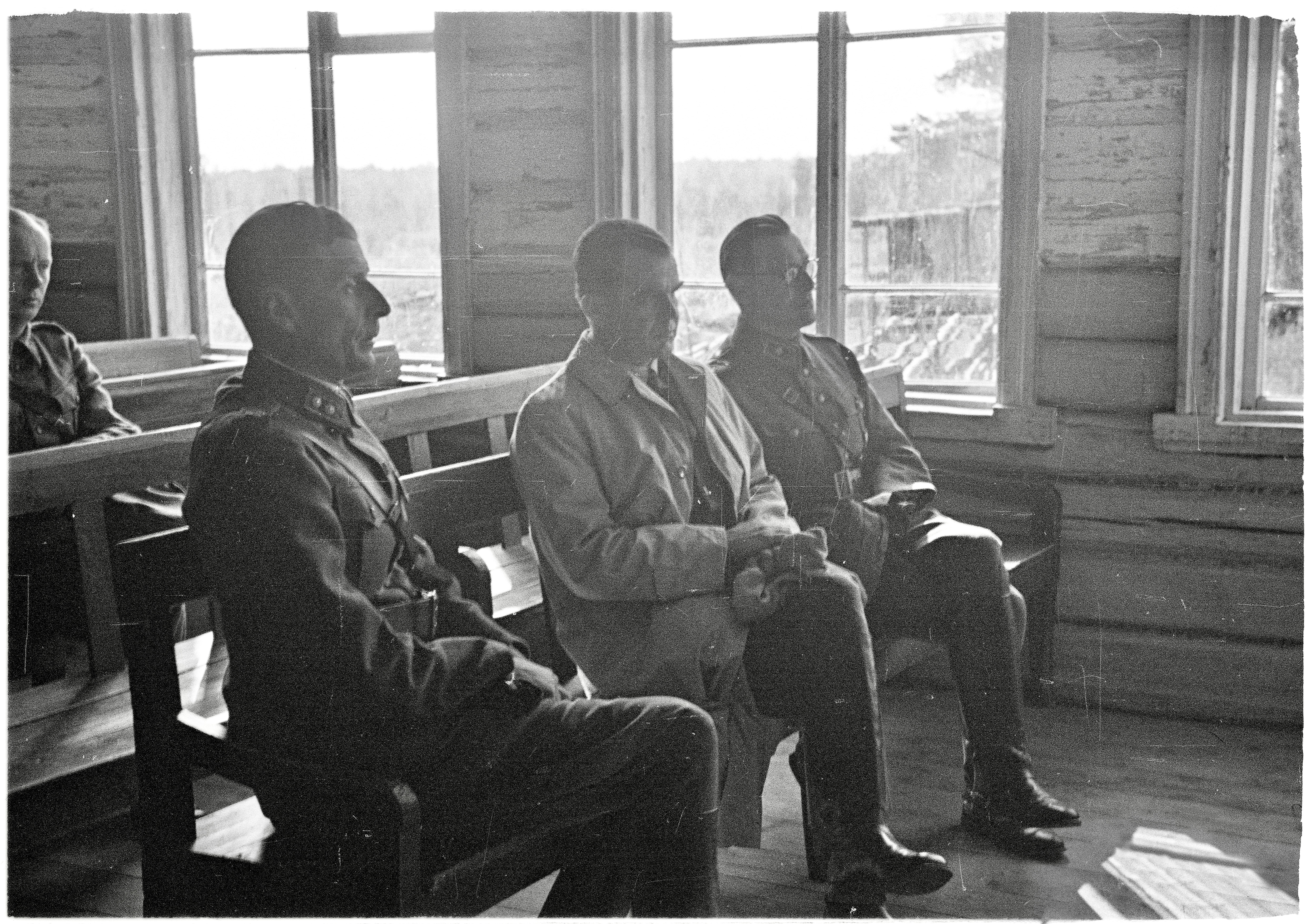 핀란드 총리 유카 랑겔(가운데), 동카리알라 군정청의 요한 아라유우리 소장(오른쪽), 올리 팔로헤이모 중령(왼쪽) (1942년 여름 동카리알라의 한 마을에서).