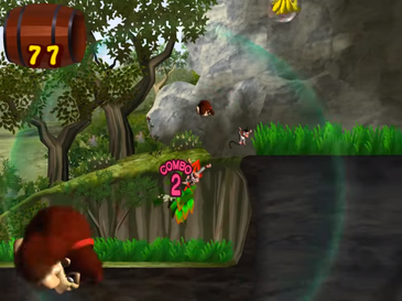 첫 번째 레벨의 스크린샷. 콤보 횟수는 동키콩이 땅에 닿지 않고 얼마나 많은 물체에서 튕겨나가는지에 따라 증가한다.