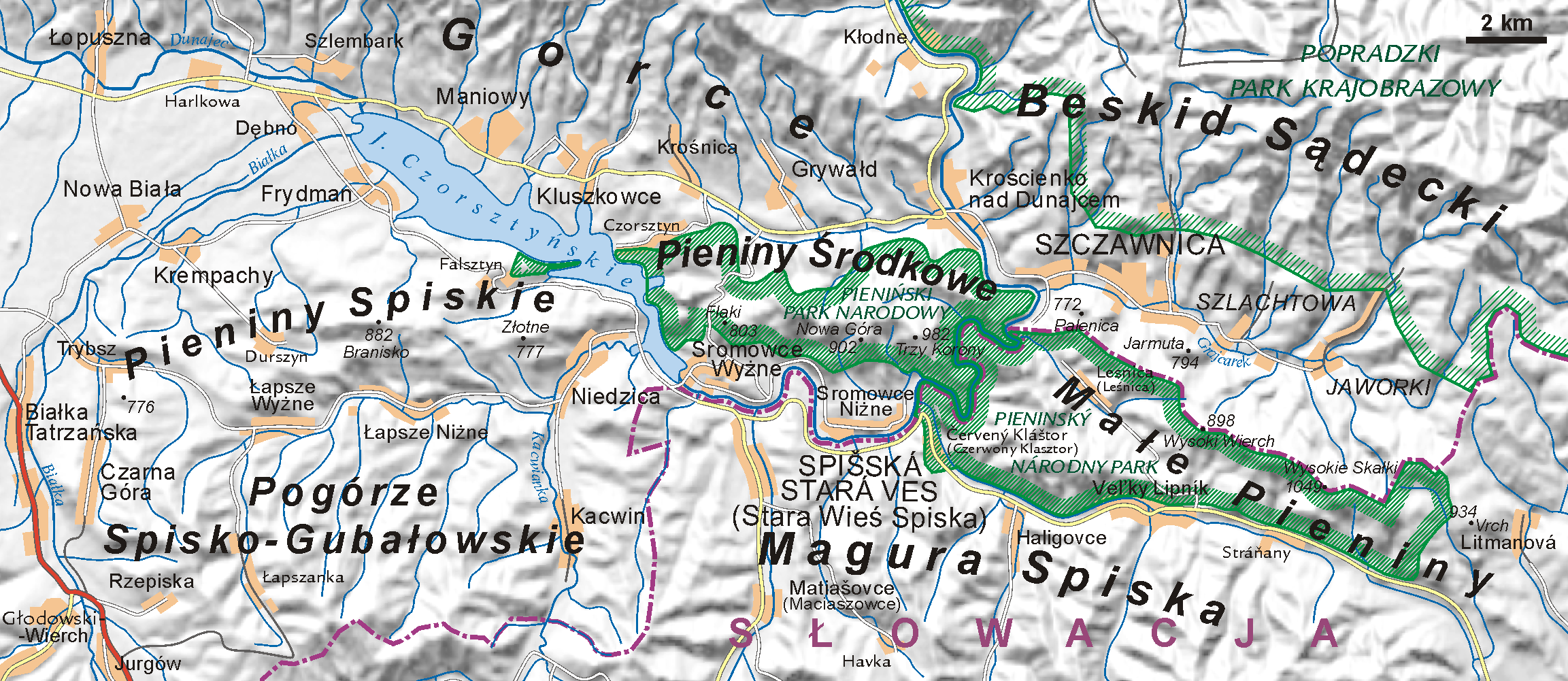 두나예츠강은 폴란드와 슬로바키아 양국에 걸쳐 흐르며, 여러 도시와 마을을 지난다.
