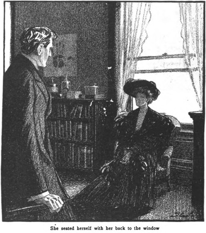 프레데릭 도르 스틸의 1905년 삽화: 레이디 힐다 트렐로니 호프가 홈즈를 방문했다. ''콜리어스''에 실림.