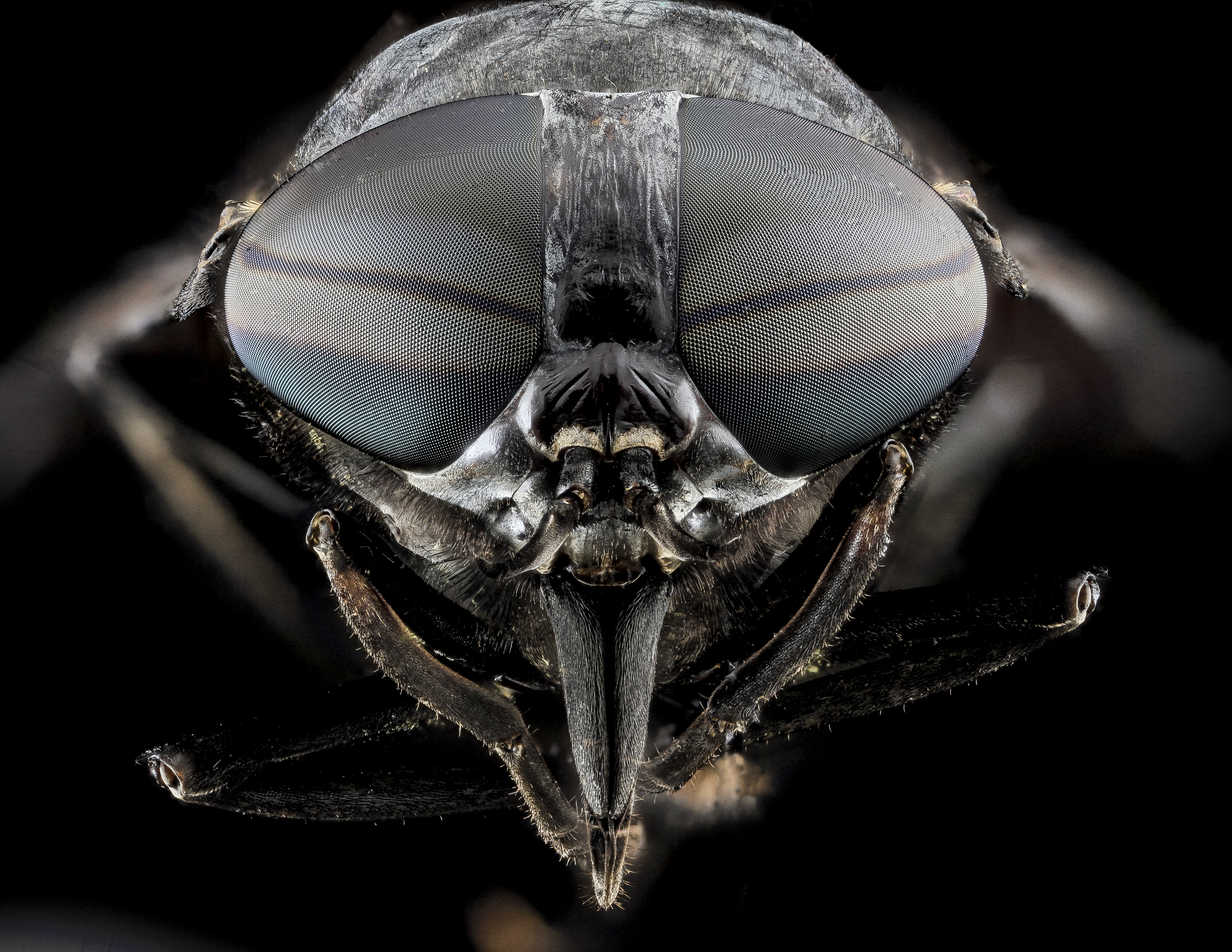 큰 겹눈, 짧은 촉각(눈 사이 및 아래), 튼튼한 천공 구기를 보여주는 ''Tabanus atratus''의 머리