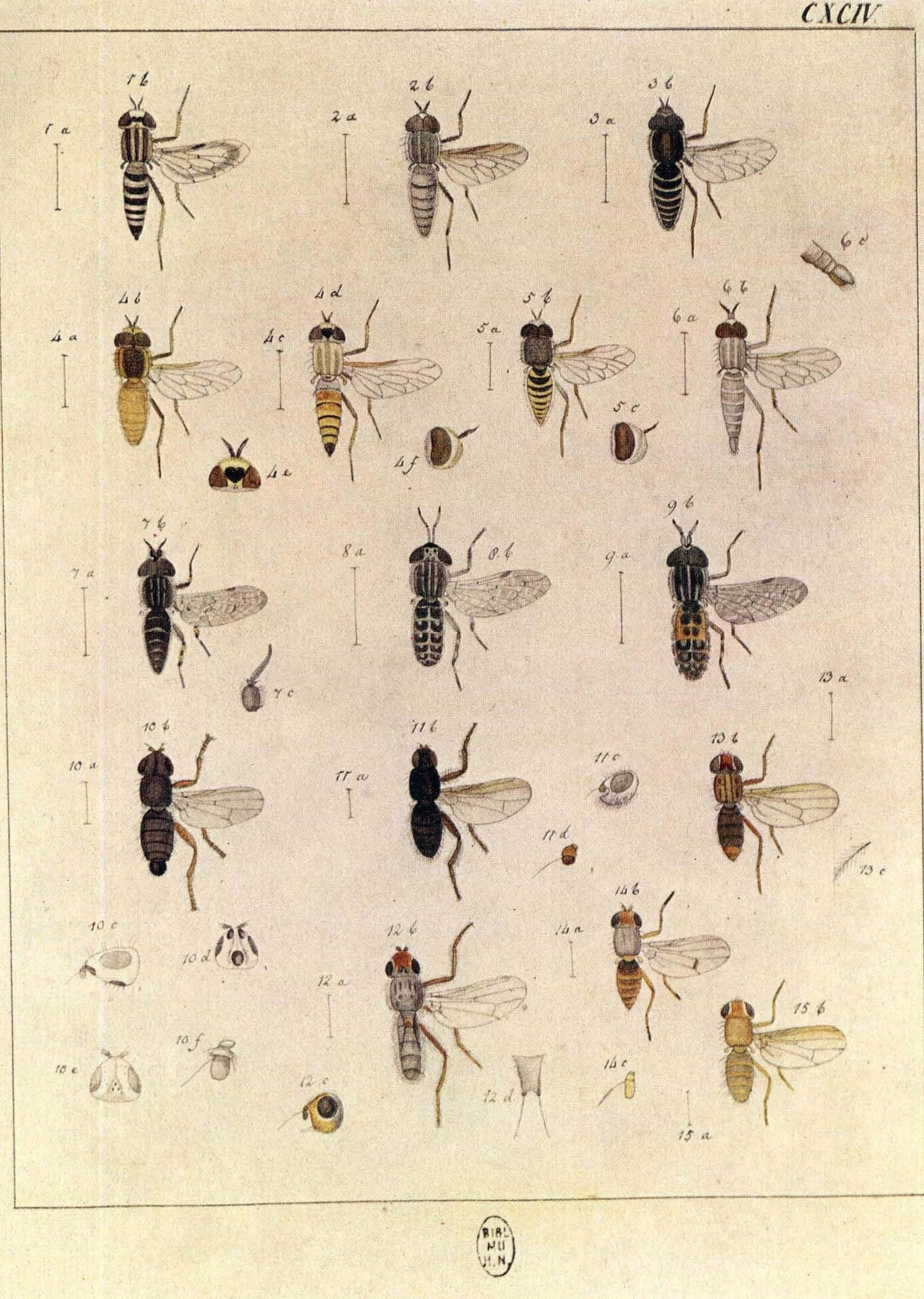 왼쪽: 요한 빌헬름 마이겐의 ''Europäischen Zweiflügeligen'' (1790)에 묘사된 말파리들(7번 ''Haematopota'' 종, 8번 ''H. crassicornis'', 9번 ''H. pluvialis'')