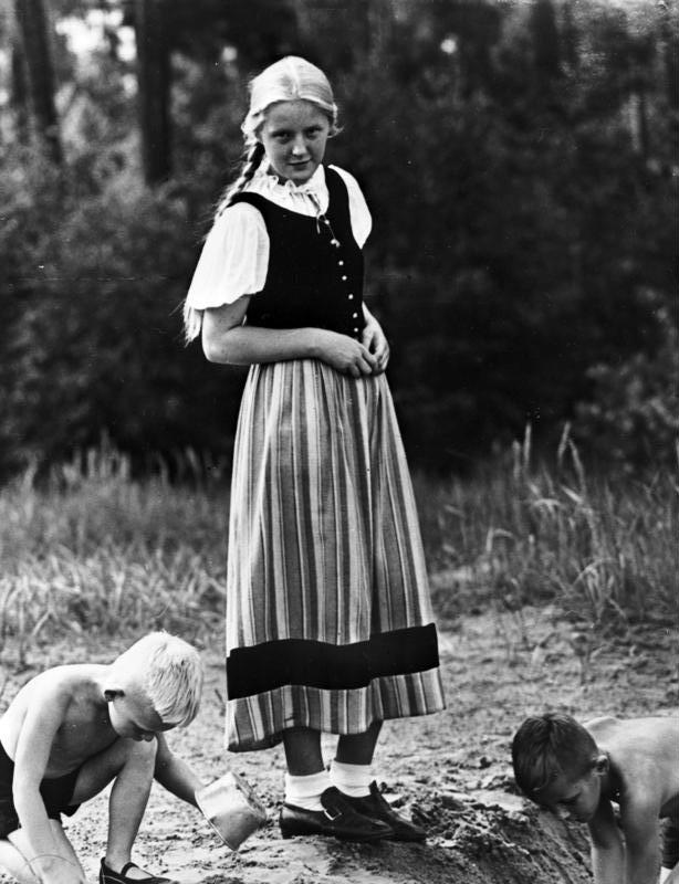 나치 치하 국가들(1933년부터의 독일, 1938년부터의 오스트리아)에서 디른들을 포함한 독일 전통 의상은 범게르만 정체성의 상징으로 나치에 의해 도구화되었다.[8] 디른들은 독일 여성을 근면하고 다산적인 존재로 묘사하는 나치의 이상을 홍보하는 데 사용되었다.[24]