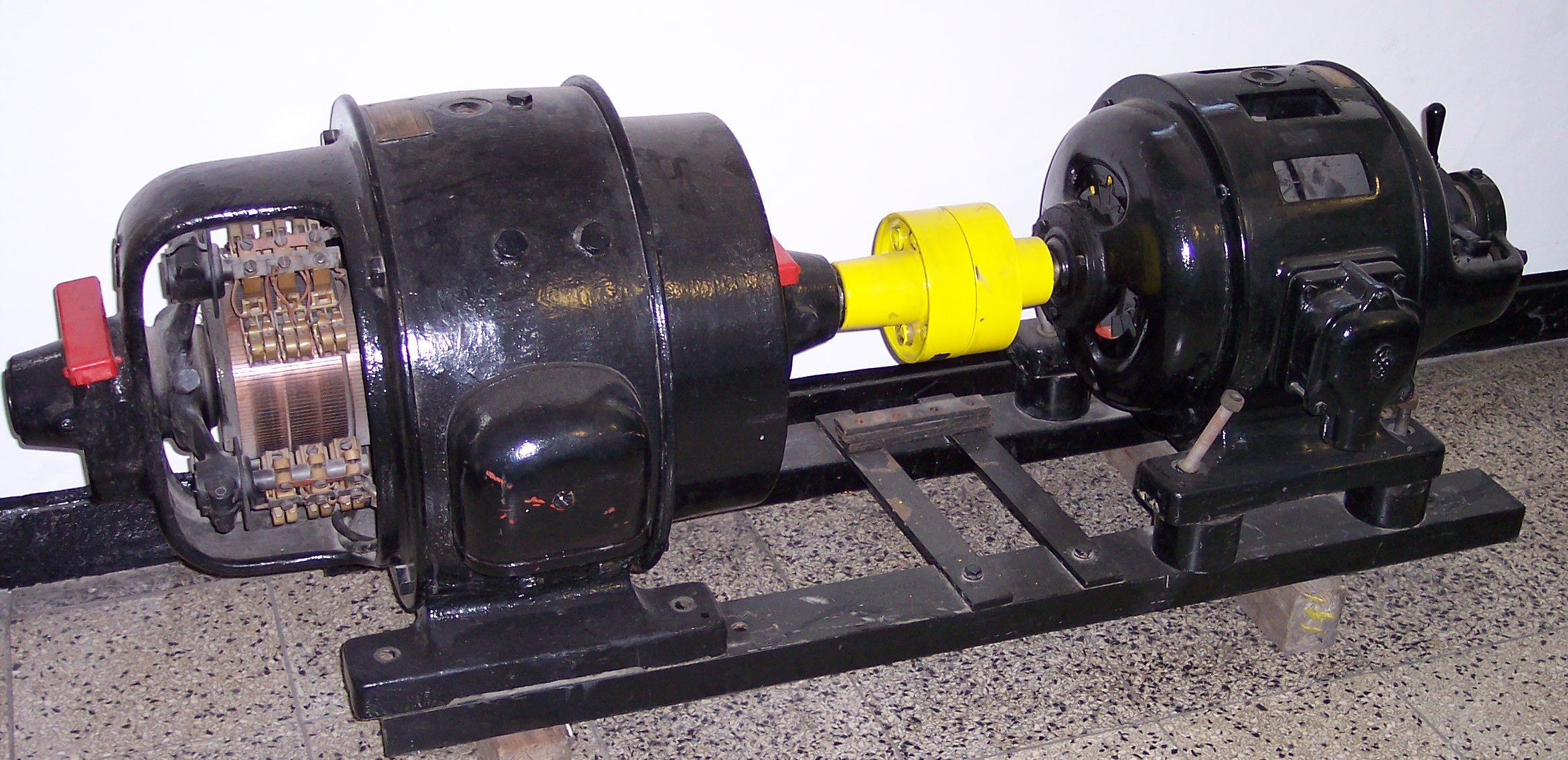 더 높은 전력이 필요한 경우에는 전동발전기(motor-generator set)가 사용되었다. 이는 전동기가 발전기를 구동하여 원하는 전압을 생성하는 방식으로, 전동기와 발전기가 분리된 형태이거나 하나의 장치로 결합된 다이나모터(dynamotor) 형태가 있었다.[4] 다이나모터는 모터 코일과 발전기 코일이 하나의 회전자(rotor)에 감겨 있고, 같은 자기장(field coil)을 공유하는 구조이다.[4] 전동발전기는 다양한 종류의 전압(DC, AC)과 위상 표준 간의 변환이 가능하여 산업용 전력 변환이나, 이동식 송수신기와 같이 높은 전압이 필요한 진공관 장비에 전원을 공급하는 데 사용되었다. 하지만 이러한 기계식 변환 방식들은 효율이 낮고 비용이 많이 드는 단점이 있었다.[1]