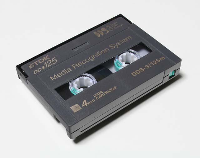 1989년 소니와 휴렛 팩커드(HP)는 DAT 테이프를 사용한 데이터 저장 규격인 '''DDS-1'''을 정의했다. DDS-1은 3.8mm 폭의 테이프를 사용하며, 60m 또는 90m 길이의 테이프를 사용했다. 60m 테이프는 1.3GB(비압축) 또는 2.6GB(압축), 90m 테이프는 2.0GB(비압축) 또는 4GB(압축)의 데이터를 저장할 수 있었다. DDS-2 드라이브와의 구분을 위해 미디어 인식 시스템 표시가 도입되었으며, 1993년부터 DDS-1 테이프는 리더 테이프에 미디어 인식 시스템 표시를 포함했다. 이는 DDS 로고 뒤에 4개의 세로 막대로 표시되었다.[4]