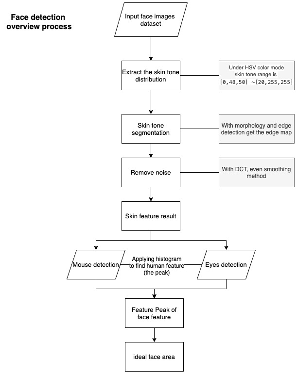 얼굴 검출수학적 형태학, 일반적으로 DCT라고 하는 이산 코사인 변환, 그리고 수평 투영(수학)을 사용하여 구현할 수 있다.