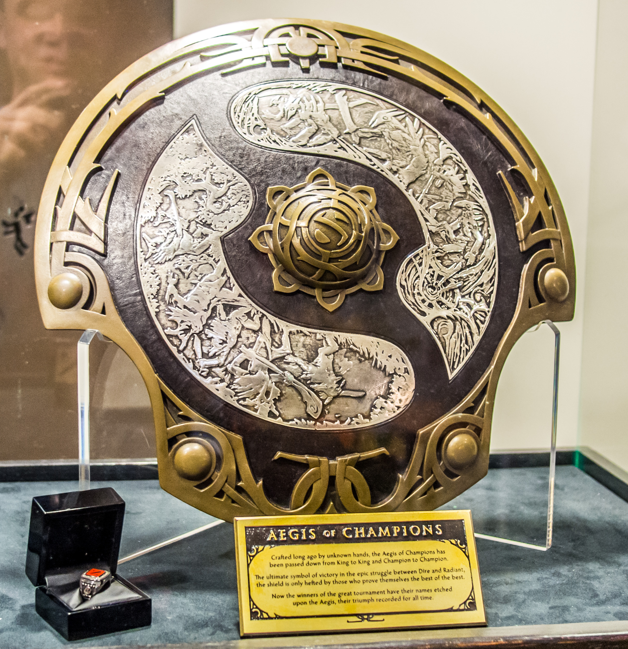 챔피언의 아이기스(The Aegis of Championseng)는 디 인터내셔널 우승팀에게 수여되는 트로피이다. 트로피 뒷면에는 우승팀 선수들의 이름이 영구적으로 새겨진다.[64][61] 아이기스는 노르웨이 및 중국 디자인에서 영감을 얻은 방패 모양으로, 웨타 워크숍에서 청동과 은을 사용하여 제작하였다.[64] 또한, 컴펜디엄 레벨이 일정 수준 이상인 소유자에게는 미니어처 복제품이 수여되기도 한다.[65]