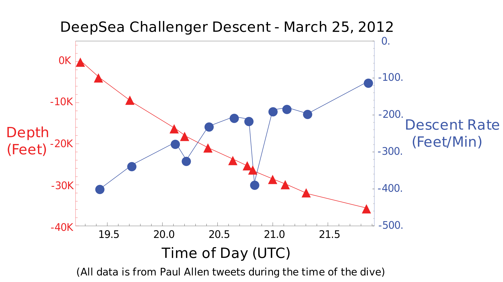 제임스 카메론의 딥씨 챌린저호의 하강과 상승은 협정 세계시(UTC) 기준으로는 3월 25일에 시작되어 3월 26일에 끝났지만, 괌 시간을 사용할 경우 전체 잠수는 2012년 3월 26일에 이루어졌다. 아래의 두 그래프는 폴 앨런이 자신의 요트 ''옥토퍼스''에서 수중 전화를 통해 잠수 진행 상황을 모니터링하며 보낸 메시지를 바탕으로 작성되었다.[142] 상승 시에는 하강 시만큼 데이터가 많지 않다.