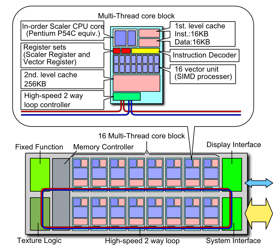 - CPU 코어 블록: 펜티엄 P54C 수준의 스칼라 연산부와 16-wide 벡터 유닛, 레벨 1 및 레벨 2 캐시 메모리로 구성된 동질적인 코어이다[40].