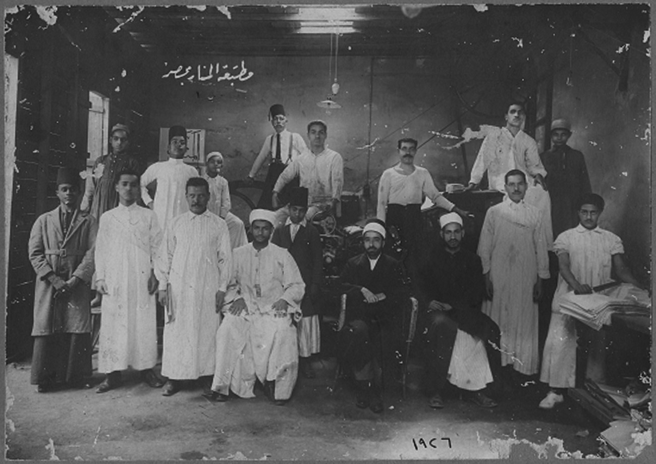 라시드 리다가 운영한 ''알-마나르(Al-Manar)'' 프레스 직원들. ''알-마나르''는 범이슬람주의(pan-Islamist) 혁명적 주제와 이슬람 부흥주의 이상을 위한 세계적인 매체가 되었다.