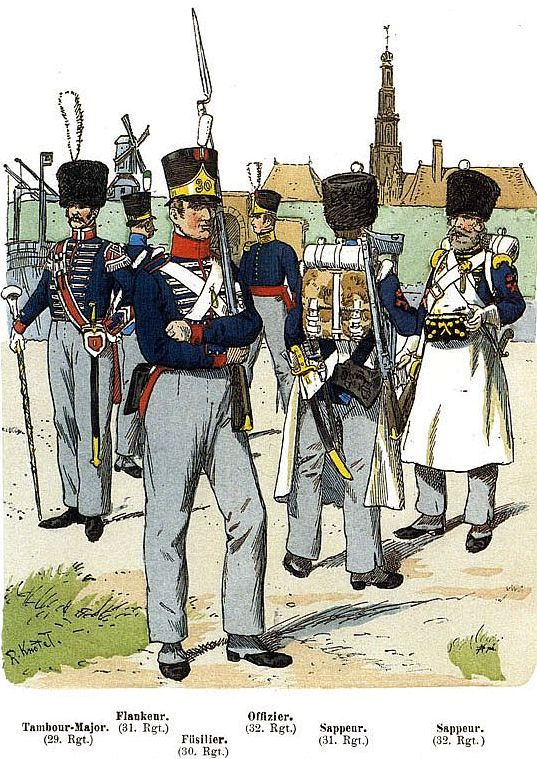 Number of officers and men in the various regiments (peacetime establishment): Regiment "Zwitsersche Guardes", 800 men; Regiment "De Stuerler", 1,800 men; Regiment "De May", 1,800; Regiment "Schmidt-Grünegg", 1,800; Regiment "Hirzel", 1,800; Regiment "De Stockar", 1,800.