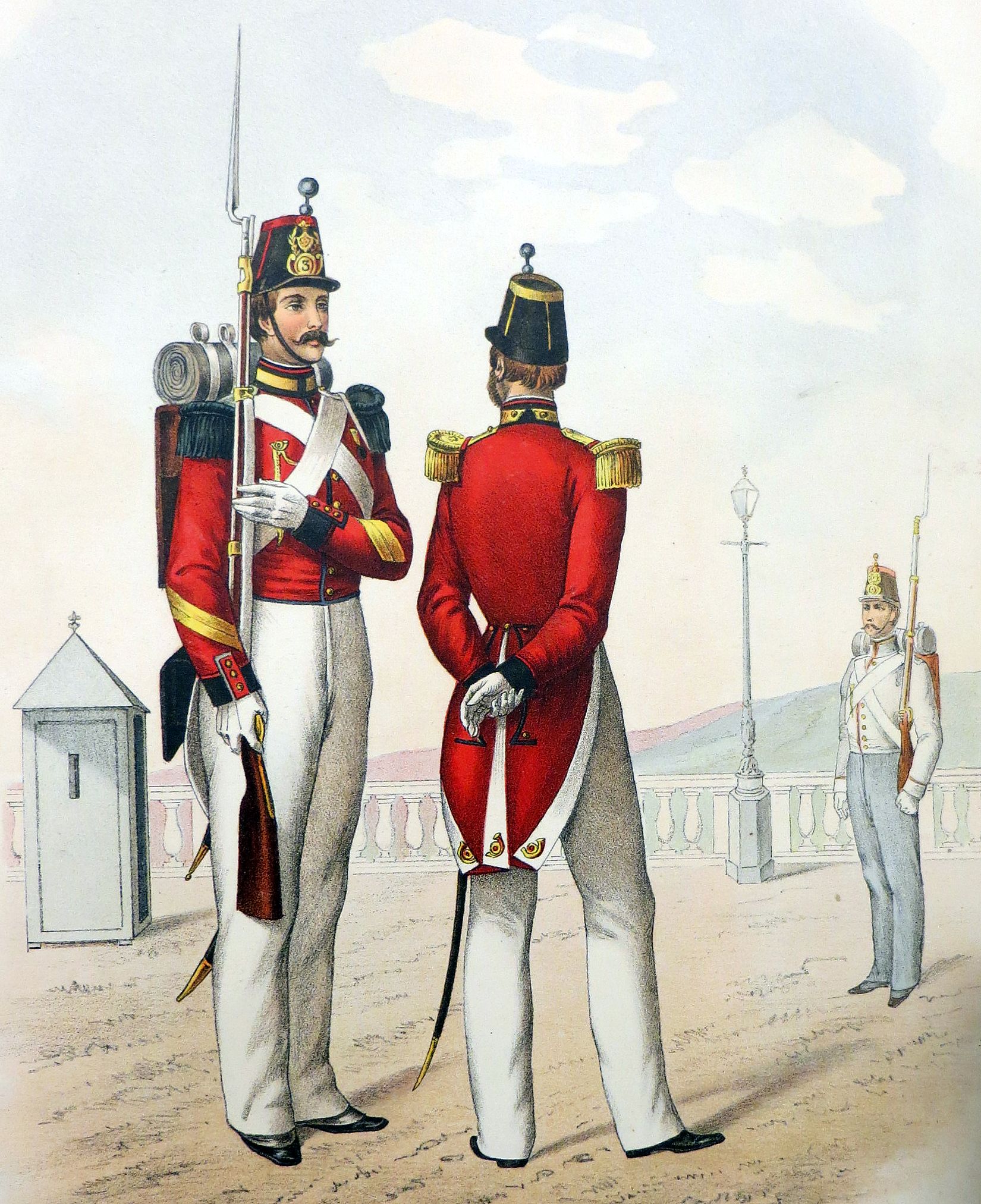 스위스 연대는 반도 전쟁의 다음 해에 막대한 손실을 입어 1812년에는 수백 명에 불과했다.[23] 그들은 마침내 ''자유 3년'' 동안 1823년에 해산되었다.[22] 스페인 군대에서 싸운 스위스 군인들은 일반적으로 그 조직, 전술 및 복장을 따랐다. 그러나 스위스 연대는 스페인 정규 보병의 흰색 군복과 달리 파란색 코트로 구별되었다.[27]
