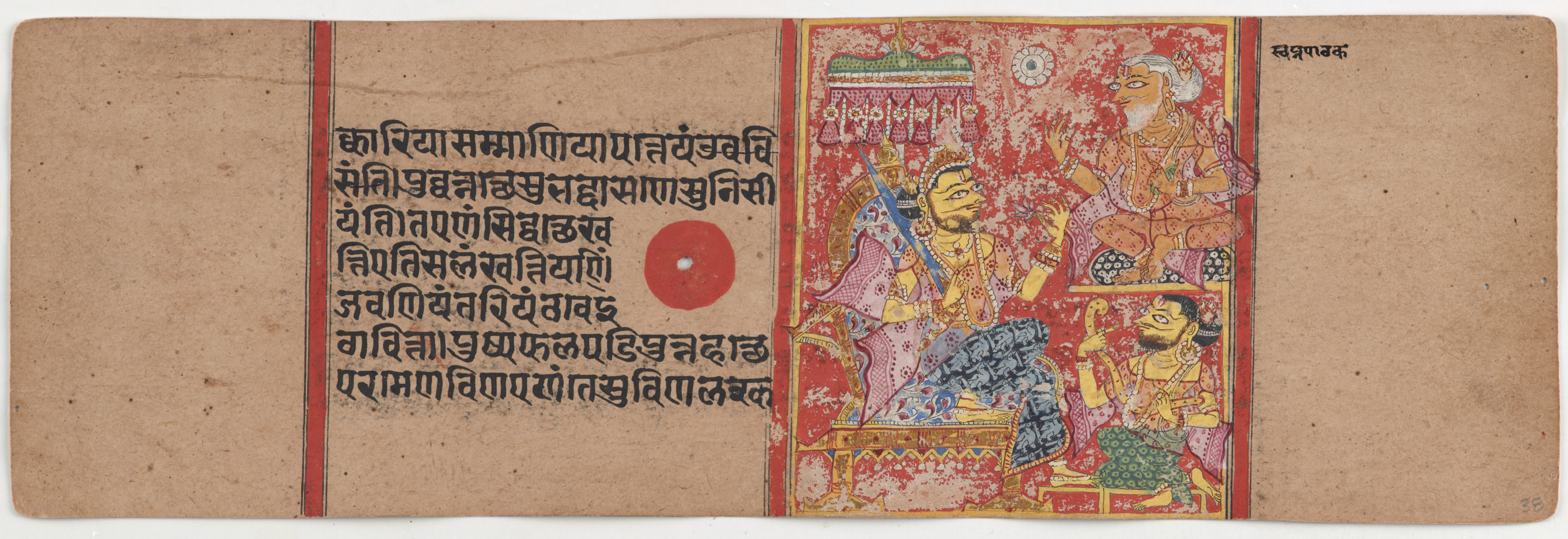 중세 후기 인도 회화의 지배적인 형태는 필사본 회화였다. 초기 인도 서적은 탈리포트 야자 잎으로 만든 페이지에 기록되었고, 길고 가로로 긴 형식이었다.[1] 1400년경 이후 인도에서 종이가 풍부해졌지만, 전통적인 형식은 매우 느리게 바뀌었다.[1]16세기 초 북인도 회화는 자이나교, 힌두교, 이슬람교의 세 가지 범주로 나눌 수 있다. 자이나교 회화는 서인도(특히 구자라트주)에서 흔히 볼 수 있었으며, 삽화가 들어간 텍스트는 일반적으로 자이나교와 관련이 있었고, ''칼파 수트라''와 ''칼라카르야 카타'' 사본이 가장 자주 의뢰되었다.[2] 서인도 미니어처는 색상이 매우 제한적이었고, 평면적이고 명확하게 경계가 정해진 영역에 적용되었다. 자이나교 회화의 독특한 특징은 생생하고 활력 넘치는 선 그림, 힌두교 그룹보다 덜 강렬하고 활기 넘치는 색상, 많은 필사본에서 장면이 반복되는 특징이다.[3]