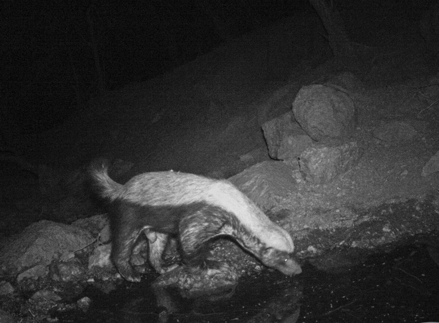 겨울 털은 길고(등 아래쪽 40mm에서 50mm) 거친 강모 형태이며 속털은 거의 없다. 여름 털은 더 짧고(등 15mm) 듬성듬성하다. 머리 측면과 몸통 하단은 순수한 검은색 털로 덮여 있으며, 머리 위쪽에서 등과 꼬리 밑동까지 이어지는 넓은 흰색 또는 회색 띠가 있다.[30][59][61] 아종 중 하나인 ''cottoni''는 몸 전체가 검은색이라는 독특한 특징을 가진다.[13]