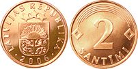 ![]() | 1 s | €0.014 | 구리 도금 강철 | 15.65mm | 1.6g | 매끄러움 | 1992, 1997, 2003, 2005, 2007, 2008 | 앞면: 작은 라트비아의 문장, "LATVIJAS REPUBLIKA" 문구와 발행 연도. 뒷면: 액면가, 작업의 하루를 상징하는 5개의 아치로 연결된 민족학적 태양 장식. |
