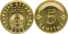 ![]() | 5 s | €0.071 | 구리/니켈/아연 합금 | 18.5mm | 2.5g | 매끄러움 | 1992, 2006, 2007, 2009 | 앞면: 작은 라트비아의 문장, "LATVIJAS REPUBLIKA" 문구와 발행 연도. 뒷면: 액면가, 작업의 하루를 상징하는 5개의 아치로 연결된 민족학적 태양 장식. |