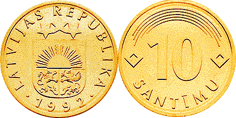 자주 사용되는 동전 | 1 산티임스, 2 산티임스, 5 산티임스, 10 산티임스, 20 산티임스, 50 산티임스, 1 라츠, 2 라티 |