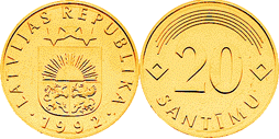 라트비아가 소련으로부터 독립을 되찾은 후, 짧은 기간 동안 사용된 Latvijas rublis|라트비야스 루블리스lav를 대체하여 1993년에 라츠가 재도입되었다. 교환 비율은 1 라츠 = 200 루블리스였다.2. 3. 1. 동전