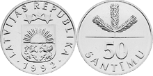 ![]() | 50 s | €0.711 | 구리-니켈 합금 | 18.8mm | 3.5g | 톱니 | 1992, 2007, 2009 | 앞면: 작은 라트비아의 문장, "LATVIJAS REPUBLIKA" 문구와 발행 연도. 뒷면: 라트비아 숲을 상징하는 소나무 묘목과 액면가가 수평선으로 분리. 가장자리: 톱니 모양. |