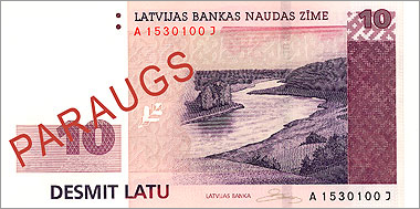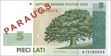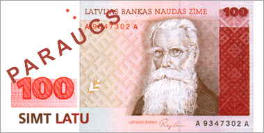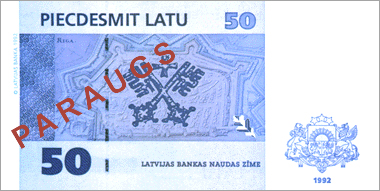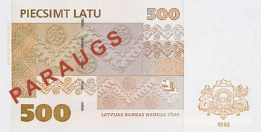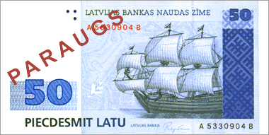 지폐는 5 라츠, 10 라츠, 20 라츠, 50 라츠, 100 라츠, 500 라츠의 6종류가 발행되었다. 모든 지폐의 크기는 130mm × 65mm이며, 독일의 기제케 앤 데브리엔트(Giesecke & Devrient) GmbH에서 인쇄되었고, 임안츠 조지크스(Imants Žodžiks)와 발디스 오시니쉬(Valdis Ošiņš)가 디자인했다.[22]현재 시리즈 | |||||||