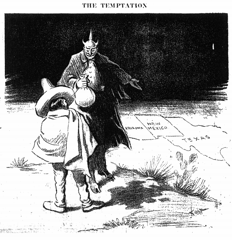 19세기 중반 미국의 서부 팽창 과정은 멕시코와의 갈등으로 이어졌다. 미국인 정착민들이 주도하여 세운 텍사스 공화국은 1836년 텍사스 혁명을 통해 멕시코로부터 독립을 선언했다. 멕시코는 이를 인정하지 않았으나, 1845년 미국이 텍사스를 합병하면서 결국 미국-멕시코 전쟁(1846-1848)이 발발했다. 전쟁은 미국의 승리로 끝났고, 과달루페 이달고 조약에 따라 멕시코는 멕시코 할양을 통해 알타 캘리포니아와 산타페 데 누에보 멕시코 등 광대한 영토를 미국에 넘겨주었다. 이 지역에 거주하던 약 6만 명의 멕시코인들은 미국 시민이 되었다.