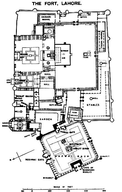 라호르성은 크게 두 부분으로 나뉜다. 첫 번째는 정문과 연결된 행정 구역으로, 정원과 왕실 접견을 위한 디완-이-카스가 있다. 두 번째는 코끼리 문을 통해 들어갈 수 있는 사적인 주거 구역으로, 쉬쉬 마할, 넓은 침실, 작은 정원이 있는 북쪽 뜰이다.[26]