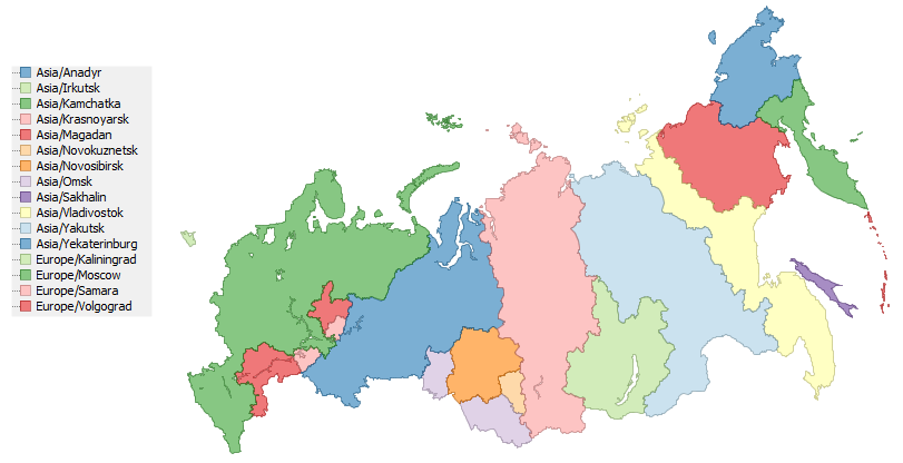 시간대 목록 | Europe/Kaliningrad Europe/Moscow Europe/Samara Asia/Yekaterinburg Asia/Omsk Asia/Krasnoyarsk Asia/Irkutsk Asia/Yakutsk Asia/Vladivostok Asia/Srednekolymsk Asia/Kamchatka Asia/Anadyr |