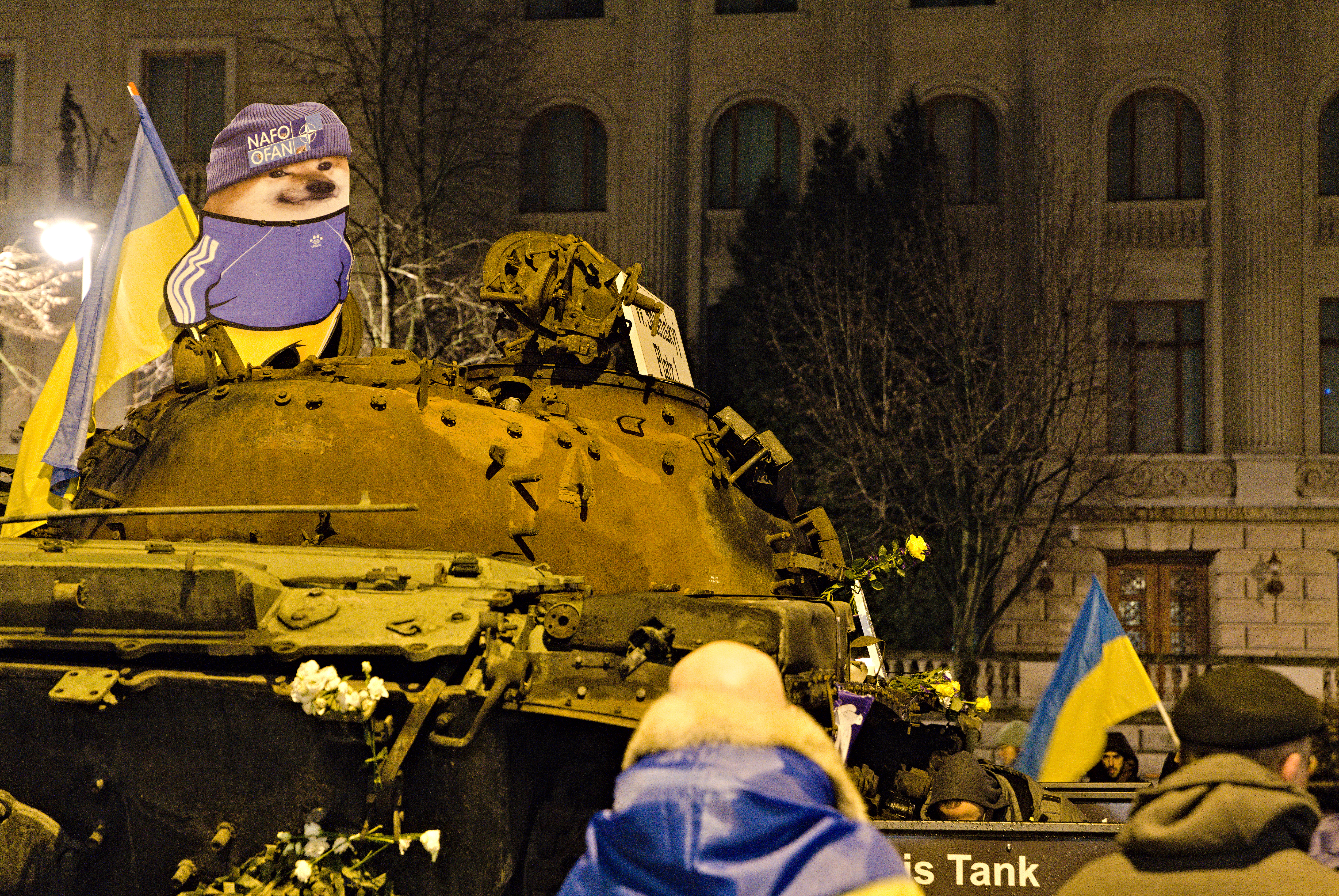 2022년 5월, NAFO라고 불리는 단체가 전쟁에 대한 무례한 댓글을 게시하고, 시바견을 기반으로 한 "만화 개"를 사용하여 우크라이나를 홍보하거나 러시아의 전쟁 노력과 전략을 조롱하는 밈을 게시하는 것을 목표로 만들어졌다. 워싱턴 포스트는 NAFO가 러시아 트롤 농장에 상당한 영향을 미쳤다고 평가했다.[295][571] 2022년 8월 28일, 우크라이나 국방부 공식 트위터 계정은 미사일 발사 이미지와 전투복을 입고 감사하는 자세로 얼굴에 손을 댄 "펠라"의 이미지를 게시하며 NAFO에 감사를 표했다.[296][572]
