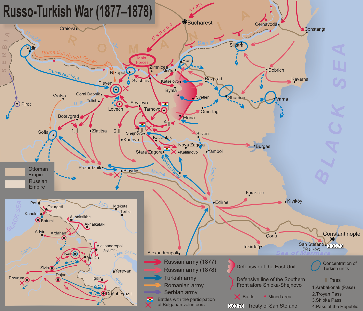 1877년 4월 24일 (구력 4월 12일) 러시아 제국은 오스만 제국에 선전 포고를 하고, 발칸 반도와 아나톨리아 반도 동부가 전장이 되는 러시아-튀르크 전쟁이 시작되었다.