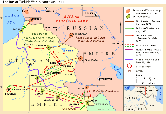 코카서스 군단은 미하일 로리스-멜리코프 장군, 아르샤크 테르-구카소프 (테르-구카소프/테르-구카시안), 이반 다비도비치 라자레프, 베이부트 쉘코브니코프 등 4명의 아르메니아인 지휘관이 이끌었다. 중장 테르-구카소프 부대는 예레반 근처에 주둔, 1877년 4월 27일 바야지드를 점령하며 오스만 영토에 대한 첫 공격을 시작했다.[50] 테르-구카소프의 승리로 러시아군은 5월 17일 아르다한을 점령했다. 5월 말, 러시아군은 카르스를 포위했으나, 오스만 증원군이 포위를 풀고 격퇴했다. 1877년 11월, 라자레프 장군은 증원군을 받아 카르스를 재공격, 남부 요새를 제압하고 11월 18일 카르스를 점령했다.[51] 1878년 2월 19일, 전략적 요새 도시 에르주룸이 장기간의 포위 끝에 러시아군에 함락되었다. 전쟁 후 에르주룸은 오스만 제국에 반환되었지만, 러시아는 바투미, 아르다한, 카르스, 올티, 사리카미쉬를 획득하여 카르스주를 설치했다.[52]