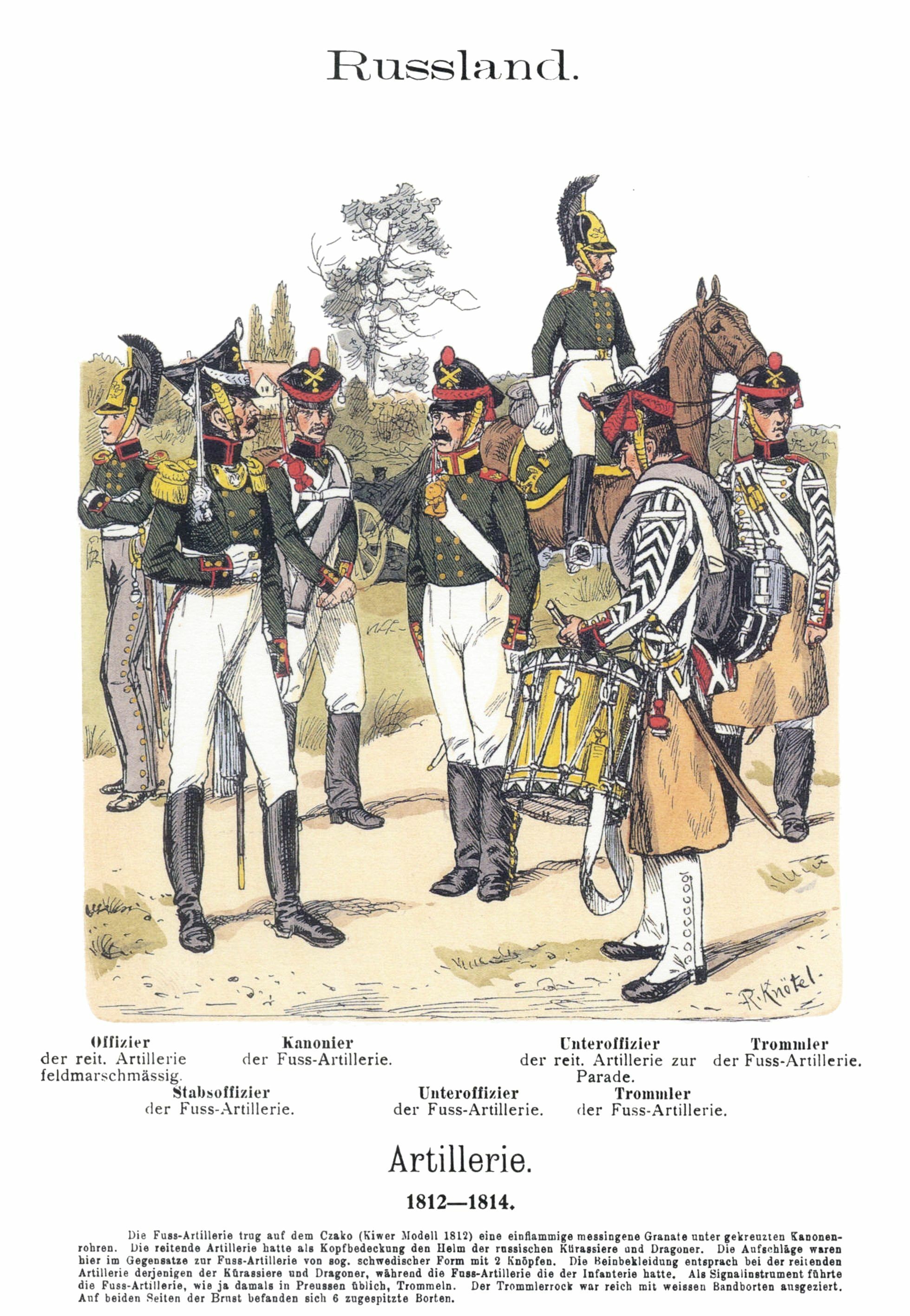 1805년 아우스터리츠 전투에서 근위대 포병은 소장 이반 카스퍼스키가 지휘하는 근위 포병 대대를 포함했다. 1812년 보로디노 전투에서 근위대 포병은 근위 보병 사단 소속 근위 포병 여단, 제1 기갑 사단 소속 코젠 대령 휘하의 근위 기마 포병, 근위 공병 대대를 포함했다.
