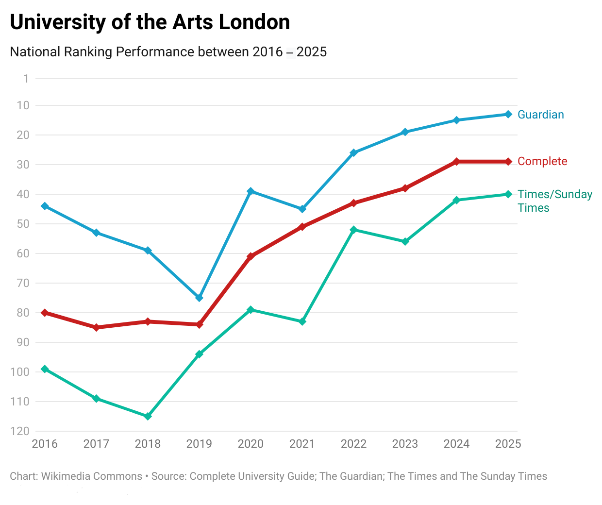 런던 예술대학교(UAL)는 2019년과 2021년에 QS 세계 대학 순위에서 예술 및 디자인 분야 2위를 차지했다.[6][7]