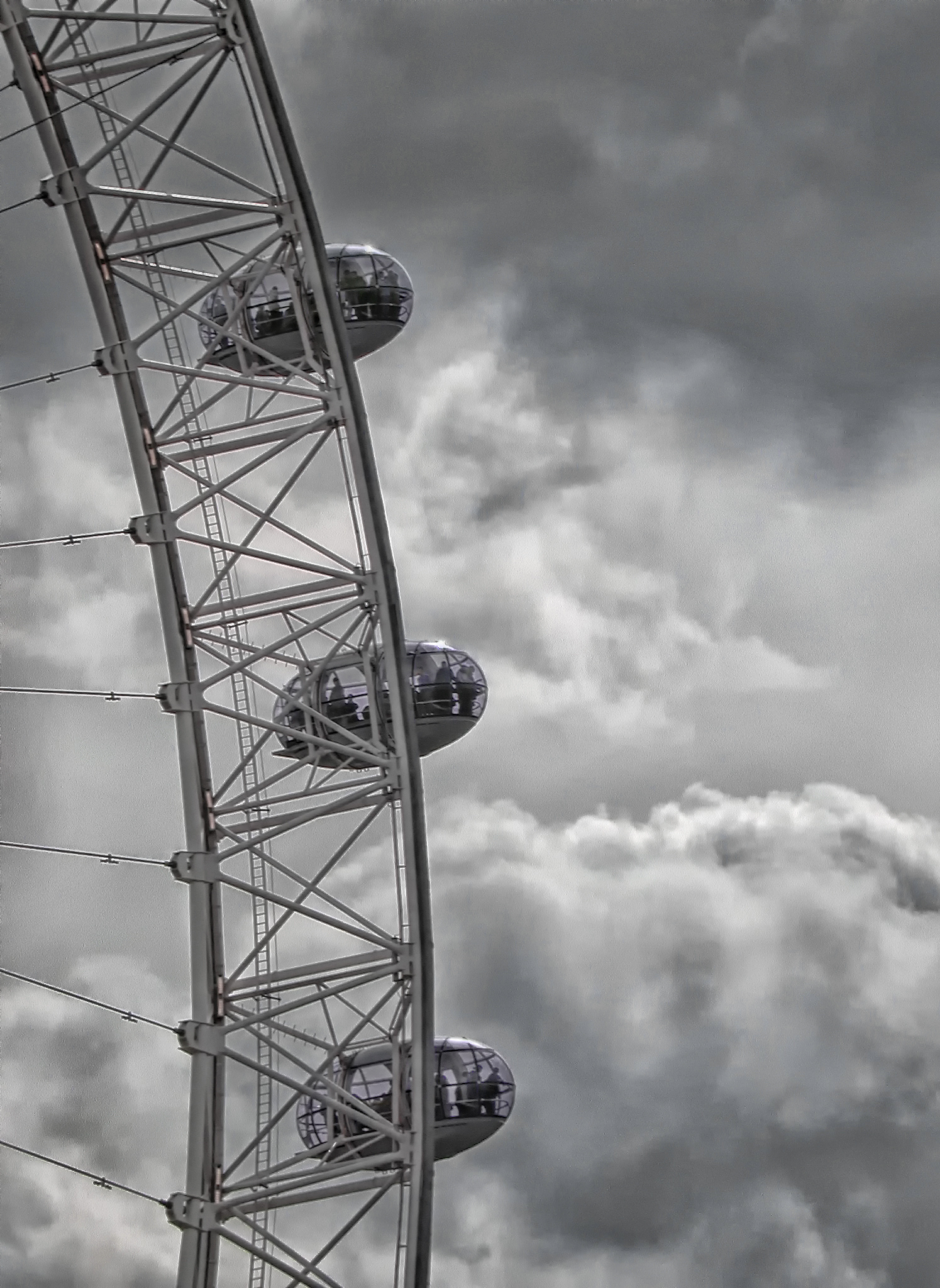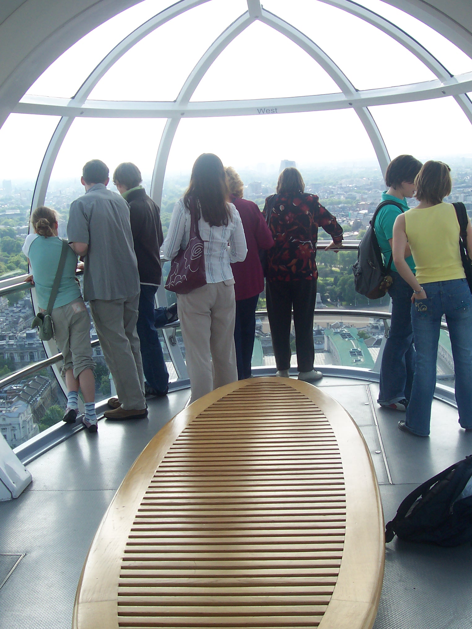 Poma가 설계 및 공급한 32개의 밀폐되고 냉방 시설을 갖춘 타원형 여객 캡슐은 관람차 외부에 부착되어 전기 모터로 회전한다. 캡슐은 미신 때문에 13번을 제외하고 1번부터 33번까지 번호가 매겨져 있다. 각 10ton 캡슐은 런던 자치구 중 하나를 나타내며 최대 25명을 수용할 수 있고, 좌석이 제공되지만 캡슐 내부를 자유롭게 돌아다닐 수 있다. 관람차는 초당 26cm (약 0.9km/h)로 회전하며 한 바퀴 도는 데 약 30분이 걸려 시간당 이론상 1,600명의 승객을 수용할 수 있다. 일반적으로 승객을 태우기 위해 멈추지 않으며, 회전 속도가 느려 승객이 지상에서 움직이는 캡슐에 타고 내릴 수 있다. 장애인 또는 노약자가 안전하게 승하차할 수 있도록 멈추기도 한다.[61]