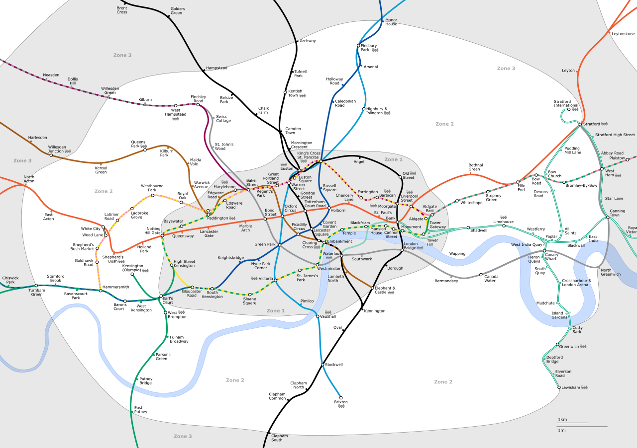 런던 지하철, DLR, 런던 오버그라운드의 운임은 런던 교통국이 설정한 구역을 기반으로 하며, 출발역, 경유역, 도착역의 구역에 따라 운임이 계산된다. 예를 들어, 출발역과 도착역이 모두 6구역이라도 3구역을 경유하지 않으면 도착할 수 없는 경우, 경유하는 모든 구역을 운임 계산에 포함하므로 3-6구역의 운임이 적용된다.[7] 1구역을 경유하지 않아도 갈 수 있는 일부 노선은 실제로 이용한 노선에 관계없이 1구역을 경유한 운임으로 계산되는 경우가 있다. 1구역을 경유하는 것이 가장 짧지만 1구역을 경유하지 않아도 갈 수 있는 노선을 오이스터 카드로 이용하는 경우, 환승 시 분홍색 환승 전용 리더에 터치하면 경유역이나 노선이 증명되어 1구역을 포함하지 않는 요금이 적용된다.[7]