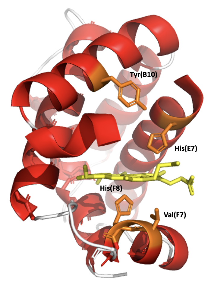 | 관련 부위 | 레그헤모글로빈, 철 결합 부위 |