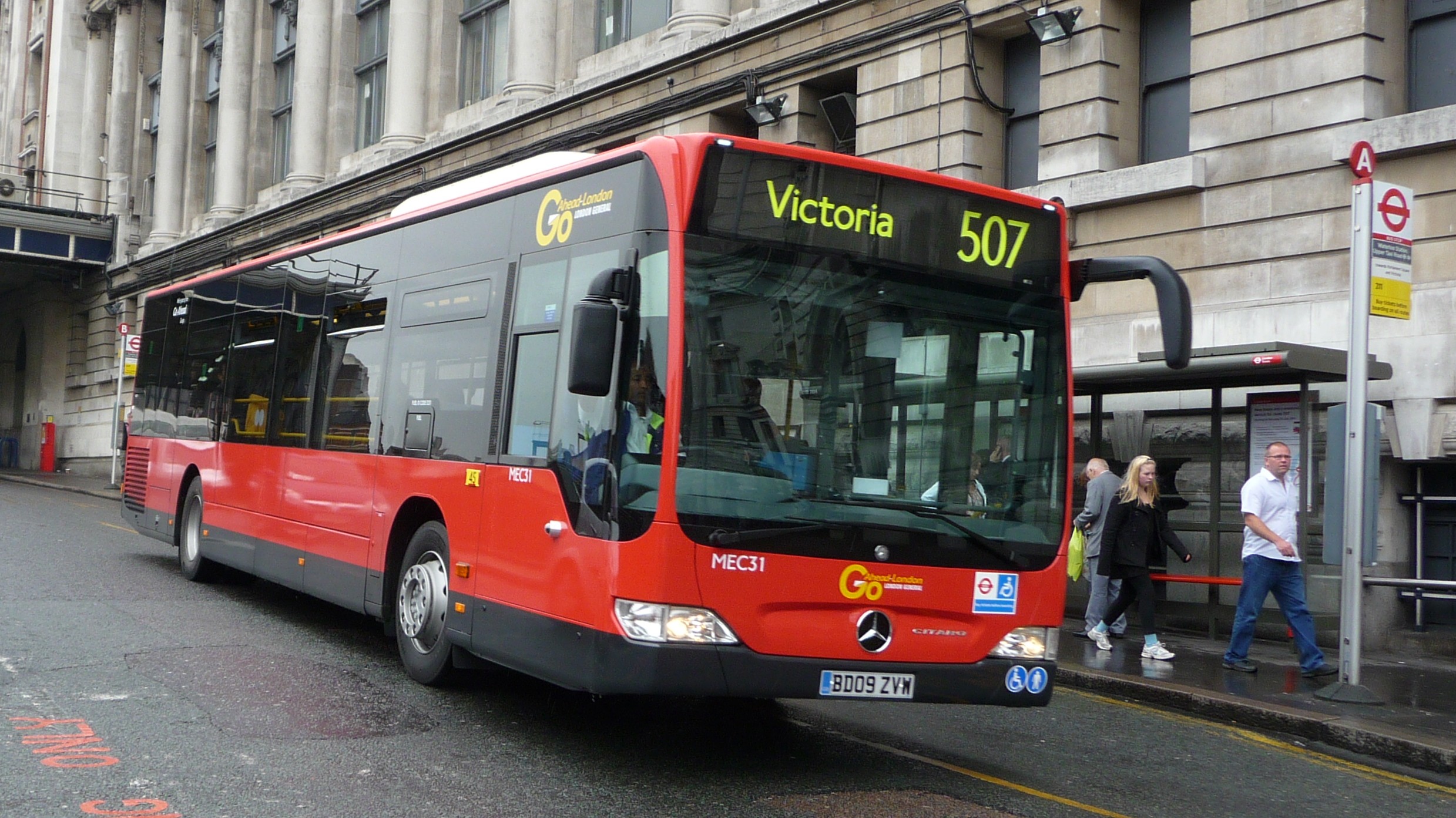 고-어헤드 런던(Go-Ahead London) 소속 메르세데스-벤츠 시타로(Mercedes-Benz Citaro) 경직형 버스가 2009년 7월 507번 노선에서 워털루역으로 운행하는 모습