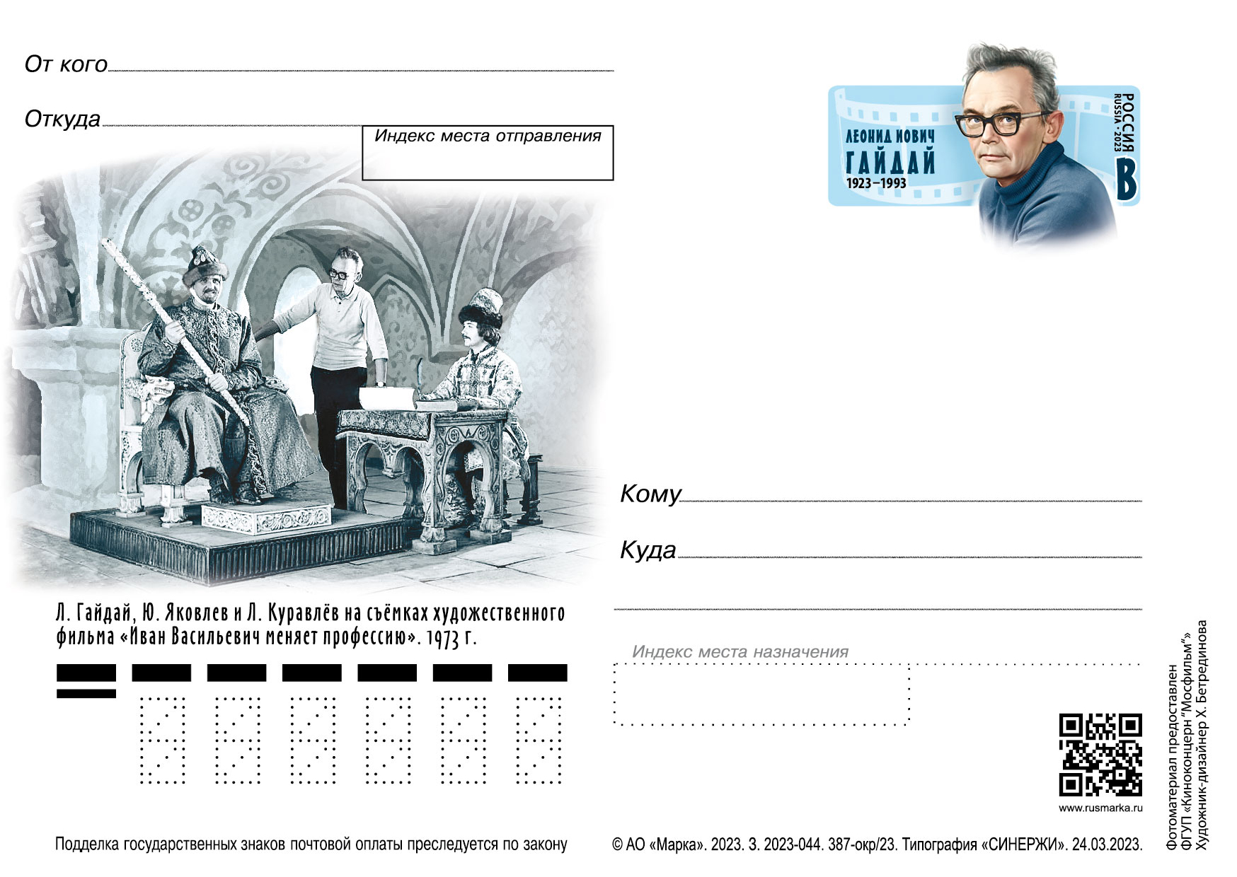 2023년 러시아 우표. 영화 ''이반 바실리비치: 미래로'' 기념. (왼쪽: 야코블레프, 가이다이, 쿠라블료프, 오른쪽: 가이다이)