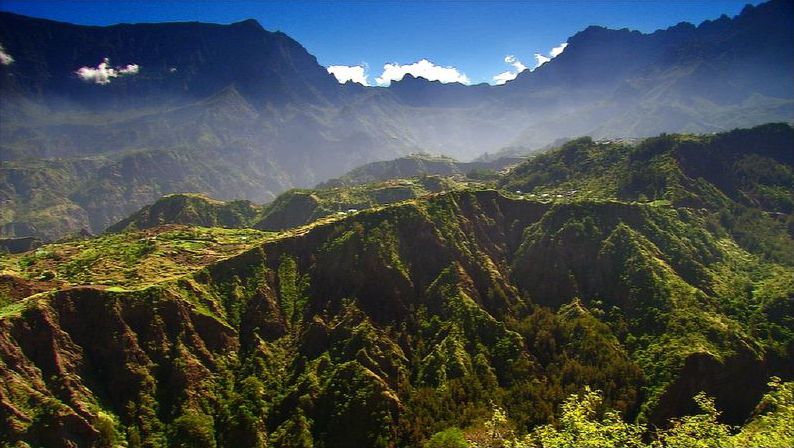 레위니옹 섬의 산; 이 새는 인간과 그들이 들여온 동물들이 도착한 후 더 높은 지역으로 제한되었을 수 있다.
