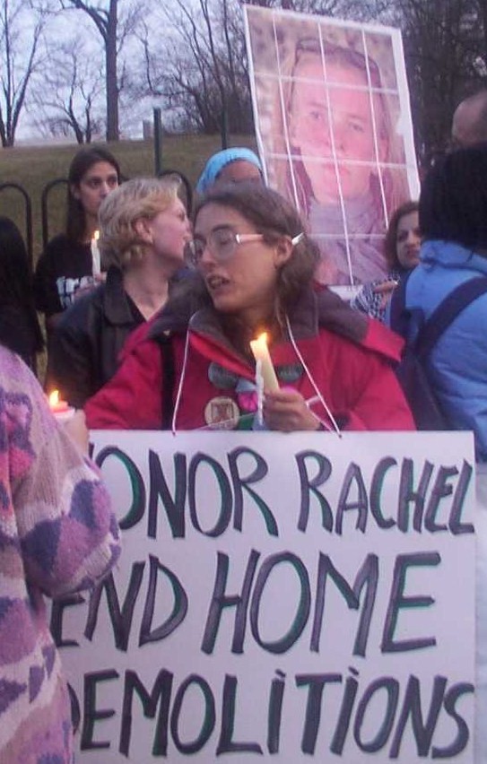 > 레이첼의 부모의 말: "우리가 동의하지 않을 수도 있지만, 이 행위는 맥락 속에서 이해해야 합니다. 레이첼은 이라크 전쟁에 반대하는 가자 지구 시위에 참여하고 있었습니다. 그녀는 두 개의 그림을 그린 아이들과 함께 작업했는데, 하나는 미국 국기였고 다른 하나는 이스라엘 국기였습니다. 레이첼은 다윗의 별이 그려진 이스라엘 국기의 그림을 불태울 수 없다고 말했지만, 전쟁을 향한 움직임과 가자 지구에서 목격한 많은 파괴에 책임이 있는 자국의 외교 정책에 항의하는 상황에서 자신의 국기 그림을 불태우는 것은 괜찮다고 느꼈습니다. 우리는 레이첼의 사망 후 팔레스타인 아이들과 어른들이 미국 국기를 덮은 가짜 관을 들고 우리의 딸을 기리는 기념식 사진을 보았습니다. 우리는 최근 몇 년 동안 가자 지구에서 우리 국기가 그렇게 존경받은 적이 없다고 들었습니다. 우리는 레이첼이 팔레스타인 사람들에게 연민의 얼굴, 즉 다른 모습의 미국을 보여주었다고 믿습니다. 우리가 가장 기억되기를 바라는 것은 미국 국기를 든 레이첼의 이 모습입니다.[27]