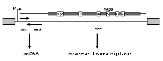 레트론 요소는 길이가 약 2kb이다. 이들은 msDNA 합성에 관여하는 ''msr'', ''msd'', ''ret'' 세 유전자좌를 포함하는 RNA 전사체의 합성을 제어하는 단일 오페론을 포함한다. msDNA의 DNA 부분은 ''msd'' 유전자에 의해, RNA 부분은 ''msr'' 유전자에 의해 암호화되며, ''ret'' 유전자의 산물은 레트로바이러스 및 다른 유형의 레트로 요소에 의해 생성되는 것과 유사한 역전사 효소이다.[1] 다른 역전사 효소와 마찬가지로, 레트론 RT는 촉매 코어와 관련된 고도로 보존된 tyr-ala-asp-asp (YADD) 서열을 포함하여 7개의 보존된 아미노산 영역(그림에서 1-7로 표시됨)을 포함한다. ''ret'' 유전자 산물은 RNA 전사체의 ''msd/msr'' 부분을 msDNA로 처리하는 역할을 한다.